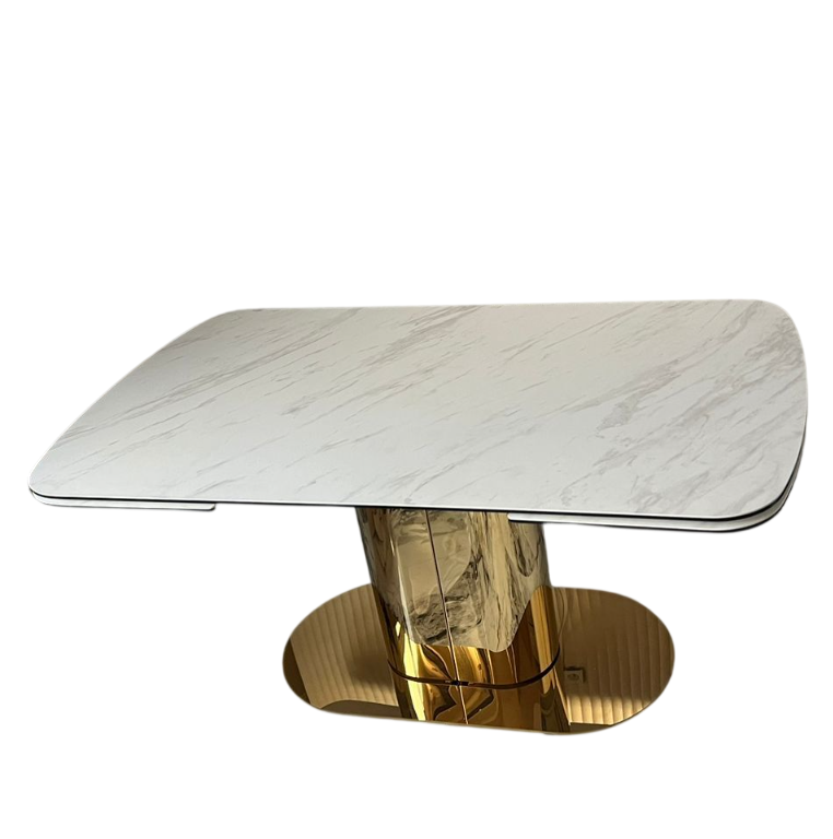 Дизайнерский обеденный раскладной стол Моника MC3034-160W – это идеальное сочетание инновационного дизайна и функциональности. Прямоугольный раскладной стол в современном стиле с закругленными краями и уникальной системой трансформации станет украшением любой столовой или кухни-гостиной. Особенности модели: - Столешница из закаленного стекла и испанской керамики цвета белый мрамор – абсолютная устойчивость к царапинам, высоким температурам и пятнам. - Две выдвижные вставки по 41 см – плавное увеличение размеров от 160 см до 242 см. - Подножье из нержавеющей стали с гальваническим покрытием "глянцевое золото" – премиальное качество и роскошный блеск. - Закругленные края – безопасность и эргономичность. - Высота 77 см – оптимальный комфорт для приема пищи. Преимущества: - Вместимость: от 4-6 до 8-10 человек при полном разложении - Универсальность: подходит для ежедневного использования и особых случаев - Практичность: керамическая поверхность не требует специального ухода - Стильный дизайн: сочетание белого мрамора и золота актуально в любом интерьере Стол Моника MC3034-160W – это выбор тех, кто ценит в мебели инновационные решения, безупречное качество и современный дизайн. Его продуманная конструкция и роскошные материалы сделают каждую трапезу по-настоящему особенной. Стол обеденный раскладной с двумя выдвижными вставками, размер 160(+41+41)*90*76 см 1) 8мм закаленное прозрачное стекло с 3мм испанской керамикой (# TL-109 цвет белый мрамор); 2) Подстолье: металл с порошковым белым окрашиванием; 3) Подножье: нержавеющая сталь с гальваническим покрытием в цвете глянцевое золото; 4) База: нержавеющая сталь, глянцевое золото 5) 1шт/3 кор 167х97х16 65х49х30 104х54х8 Гарантия 1 год