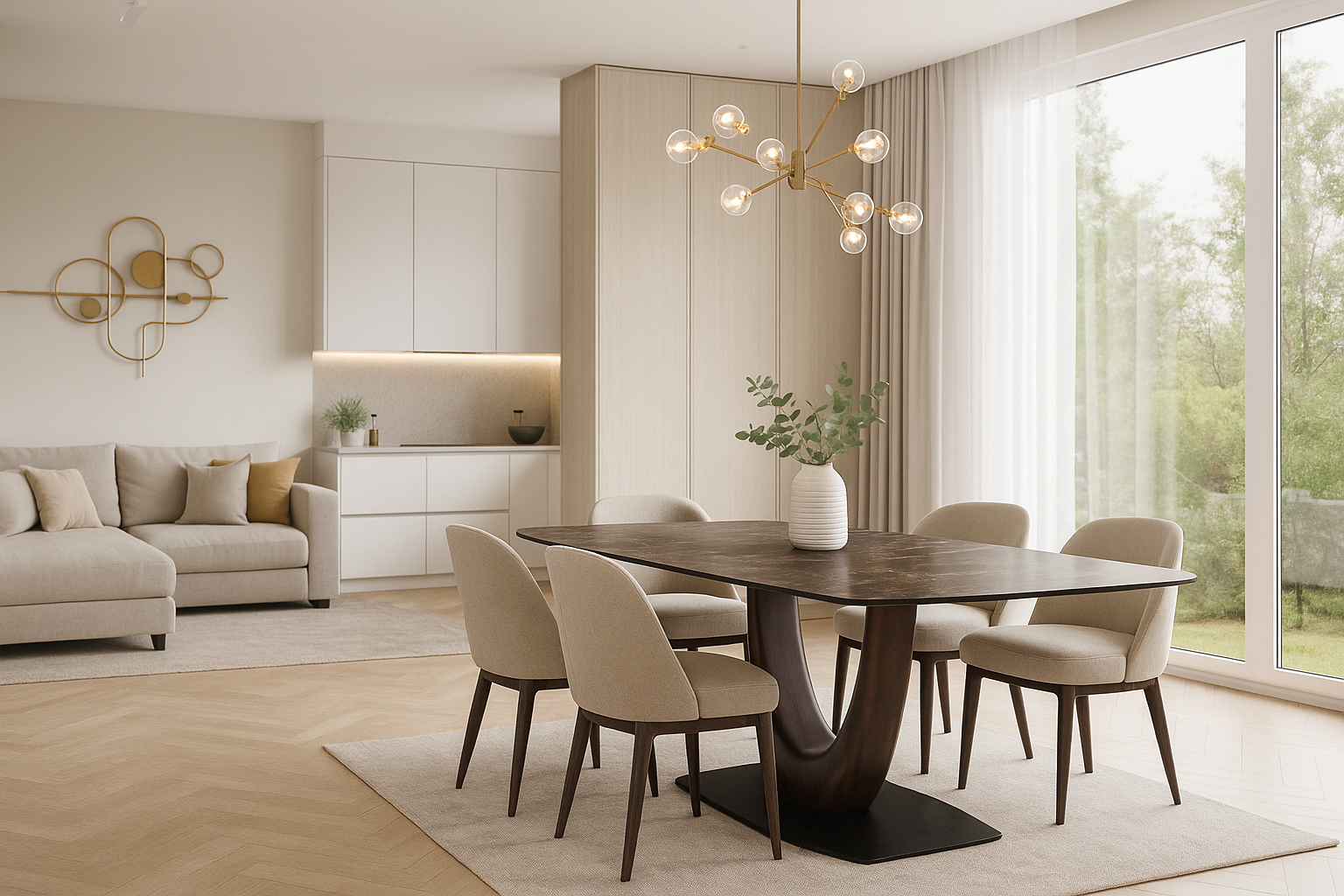 Стол обеденный Римини MC 3020-180BR — это элегантное сочетание современных технологий, прочных материалов и утонченного дизайна. Этот обеденный дизайнерский стол станет центральным элементом вашей столовой или гостиной, подчеркивая хороший вкус и статус владельца. Модель имеет классическую прямоугольную форму с закругленными краями, что делает её безопасной для использования даже в домах с детьми. Размеры 180×90 см обеспечивают комфортную посадку до 8 человек, а продуманная конструкция позволяет легко сервировать стол как для повседневных трапез, так и для торжественных случаев. Особое внимание привлекает столешница из испанской коричневой керамики (3 мм) и закаленного стекла (8 мм) — это прочные материалы, сочетающие в себе благородство внешнего вида и высокую устойчивость к загрязнениям, царапинам и перепадам температур. Глубокий оттенок придает интерьеру теплоты и создает эффект роскоши, напоминая текстуру натурального камня. Конструкция оснащена основанием из нержавеющей стали с черным порошковым покрытием, дополненным ножкой из массива дерева цвета грецкий орех. Такое сочетание материалов создаёт гармонию между технологичностью металла и естественностью древесины, делая дизайн более насыщенным и интересным. Этот обеденный стол идеально впишется в интерьеры в стиле лофт, скандинавская классика или гламурный минимализм. Он добавит помещению контраста и станет стильным акцентом пространства. Размер: 180*90*76 см Столешница: 3мм испанская керамика+8мм закаленное стекло, цвет: коричневая керамика 1шт/3кор 187*97*6 72*59*25 125*57*9 Ножка: массив дерева цвета грецкий орех Основание: нержавеющая сталь с черным порошковым покрытием 1шт/3 кор Гарантия 1 год