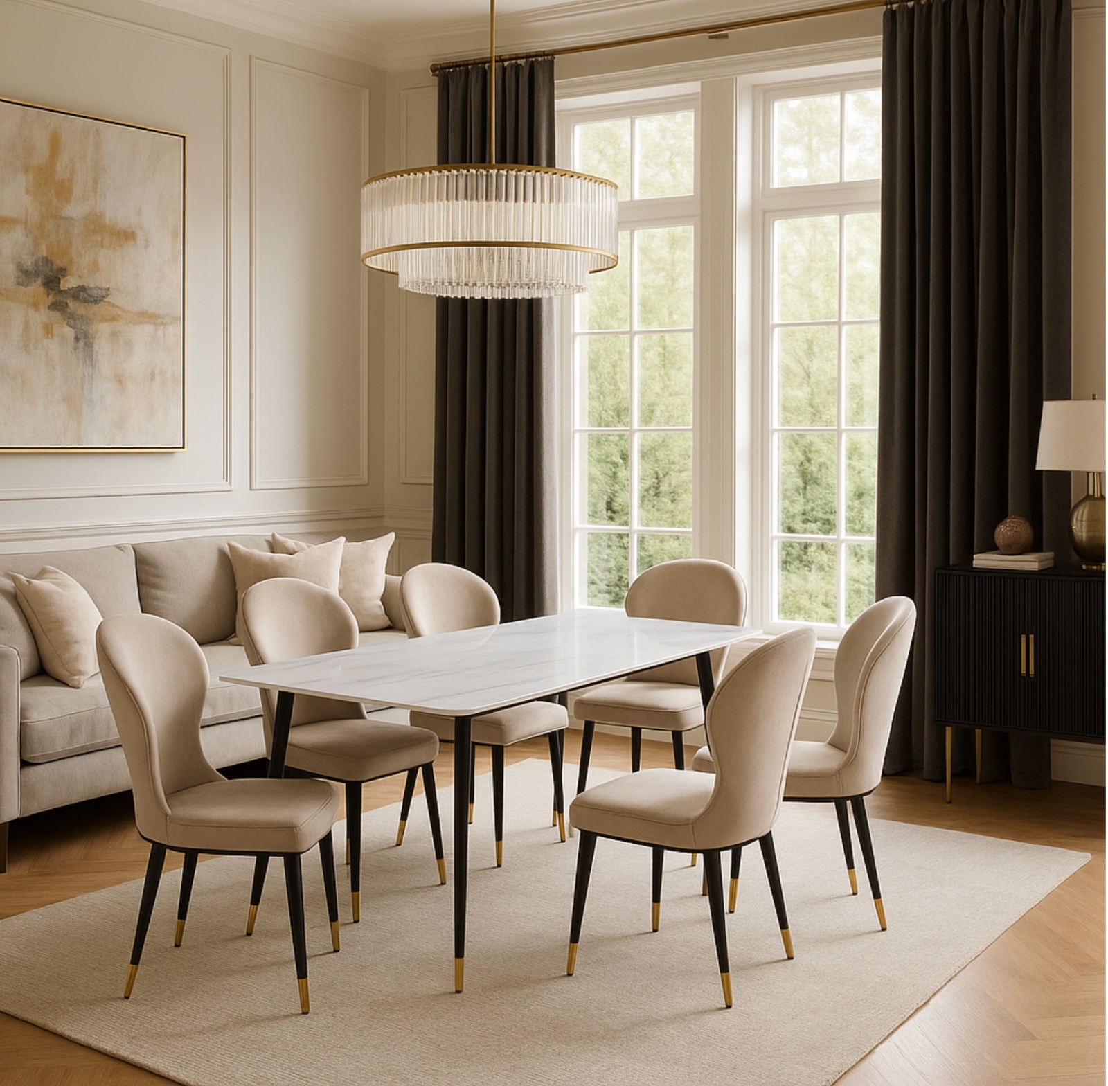 Стол обеденный Рио DT-2849 — это удачное сочетание строгого минимализма и роскоши деталей. Этот обеденный дизайнерский стол создан для тех, кто ценит современный интерьер, функциональность и эстетику в каждой детали. Модель имеет вытянутую прямоугольную форму, что делает её удобной как для повседневных завтраков, так и для неформальных встреч. Размеры 160×80 см позволяют комфортно разместить до 4 человек, а также обеспечивают достаточно места для посуды, декора и сервировки. Особое внимание привлекает столешница из керамогранита с глянцевой поверхностью цвета белый мрамор — прочный и долговечный материал, который имитирует благородную текстуру натурального камня. Поверхность устойчива к загрязнениям, царапинам и перепадам температур, при этом легко очищается и сохраняет свой первоначальный вид на протяжении многих лет. Каркас выполнен в виде ножек из нержавеющей стали с порошковым окрашиванием, дополненных декоративными золотыми наконечниками. Такое исполнение обеспечивает не только надёжность конструкции, но и создает яркий стилистический акцент. Золотые элементы добавляют изделию гламурного шарма и подчеркивают его статусный дизайн. Этот прямоугольный обеденный четырехместный стол органично впишется в интерьер в стиле минимализм, хай-тек или современная классика. Благодаря универсальной форме и цветовой гамме он одинаково хорошо будет смотреться как в светлом пространстве, так и в более темных интерьерах. Размер: 160х80х75 см Столешница: керамогранит с глянцевой поверхностью Цвет: белый мрамор Ножки: нержавеющая сталь с порошковым окрашиванием Вес нетто/брутто: 48/53 кг 1шт/2 кор Гарантия 1 год