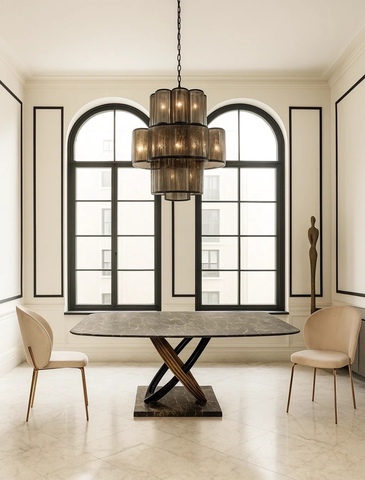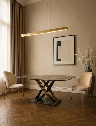Стол обеденный Сфера F-1457 — это воплощение современной эстетики, прочности и функциональности. Этот обеденный дизайнерский стол станет центральным элементом вашей столовой или гостиной, подчеркивая хороший вкус и статус владельца. Модель имеет классическую прямоугольную форму, дополненную мягкими закруглёнными краями, что делает её безопасной и удобной как для повседневного использования, так и для торжественных случаев. Размеры 180×100×76 см позволяют комфортно разместить до 8 человек, обеспечивая достаточно места для блюд и посуды на любом застолье. Особое внимание привлекает столешница из МДФ цвета черный мрамор — материал, имитирующий благородную текстуру натурального камня. Поверхность устойчива к загрязнениям, легко очищается и сохраняет свой внешний вид на долгие годы. Глубокий черный оттенок придает изделию роскошный и строгий вид. Конструкция дополнена прочным основанием из искусственного камня и металла с порошковым окрашиванием в черный и золотистый цвета, что обеспечивает не только надежность и долговечность, но и эффектный внешний вид. Такое сочетание материалов создает ощущение контраста и добавляет интерьеру гламурного акцента. Этот обеденный стол органично впишется в интерьер в стиле лофт, гламур или современная классика. Столешница: МДФ, цвет - черный мрамор Основание:металл с порошковым окрашиванием в черный и золотистый цвета, основание- искусственный камень 180х100х76 см Страна производитель: Китай Гарантия 1 год