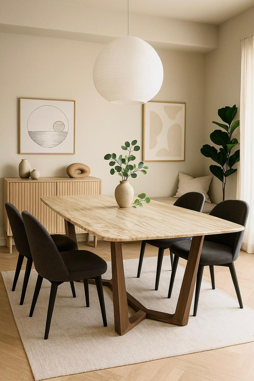Стол обеденный Верона MC-23051DT-1 — это истинное воплощение роскоши, природной эстетики и мастерства в создании мебели. Этот обеденный дизайнерский стол станет центральным элементом вашей столовой или гостиной, подчеркивая хороший вкус и статус владельца. Модель выполнена в классической прямоугольной форме, дополненной закругленными углами, что делает её безопасной и удобной в использовании даже в домах с детьми. Размеры 200×100 см позволяют комфортно разместиться до 8–10 человек, обеспечивая достаточно места для посуды, блюд и декоративных аксессуаров. Центральной особенностью стола является столешница из натурального белого мрамора с бежево-коричневыми прожилками — материал, который отличается уникальной текстурой и благородным внешним видом. Каждый экземпляр имеет индивидуальный рисунок прожилок, что делает изделие по-настоящему эксклюзивным. Поверхность с полимерным покрытием устойчива к загрязнениям и легко очищается, сохраняя свой первоначальный блеск на долгие годы. Конструкция оснащена прочным каркасом из массива каучукового дерева со шпоном грецкого ореха, что гарантирует не только долговечность, но и теплоту натуральных материалов. Такое основание из массива дерева выглядит особенно дорого и органично дополняет каменную столешницу, создавая идеальный баланс между минимализмом и классикой. Этот обеденный стол — выбор тех, кто ценит природную красоту, качество и уникальность деталей. Он легко впишется в интерьер в стиле ар-деко, современная классика или лофт. Размер: 200х100х76 см Цвет: белый мрамор с бежево-коричневыми прожилками Вес: нетто/брутто: 108,80/134,10 кг 1шт/2 кор Объем 0,79 м3 ВНИМАНИЕ: Полированное полимерное покрытие требует бережного обращения и деликатного ухода. Транспортировка, хранение и использование при температуре от 0 до 40 градусов Цельсия. Гарантия 1 год