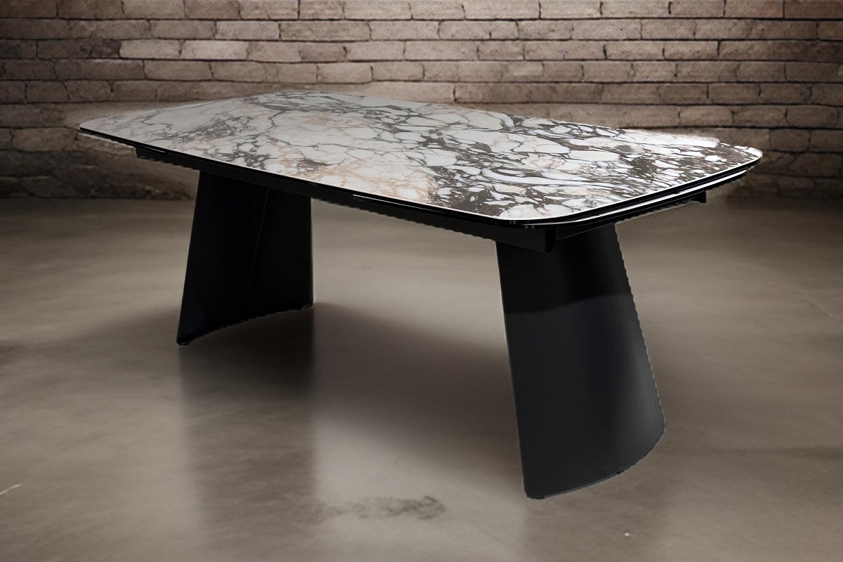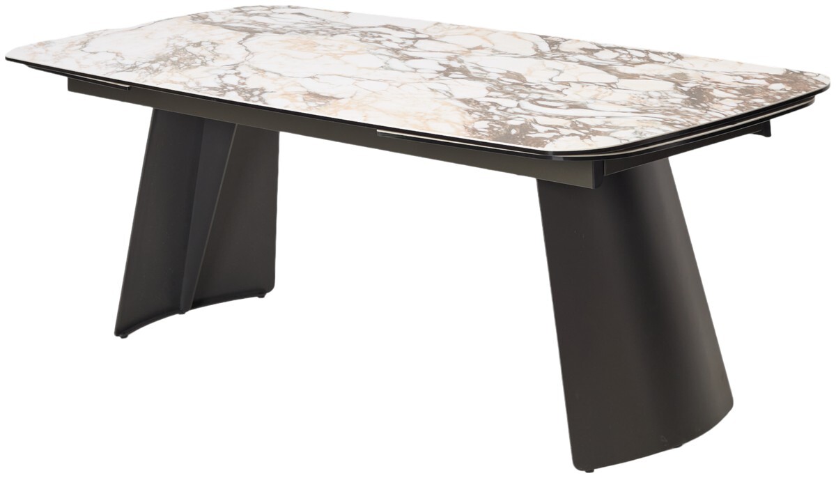 • двухсторонняя торцевая система раскладывания, две независимые вставки по краям по 50 см позволяют увеличить длину столешницы на 250 или 300 см при необходимости, испанская керамика, толщина столешницы 13 мм (3 мм керамика + 10 мм закаленное стекло), не впитывает загрязнения, термостойкая;