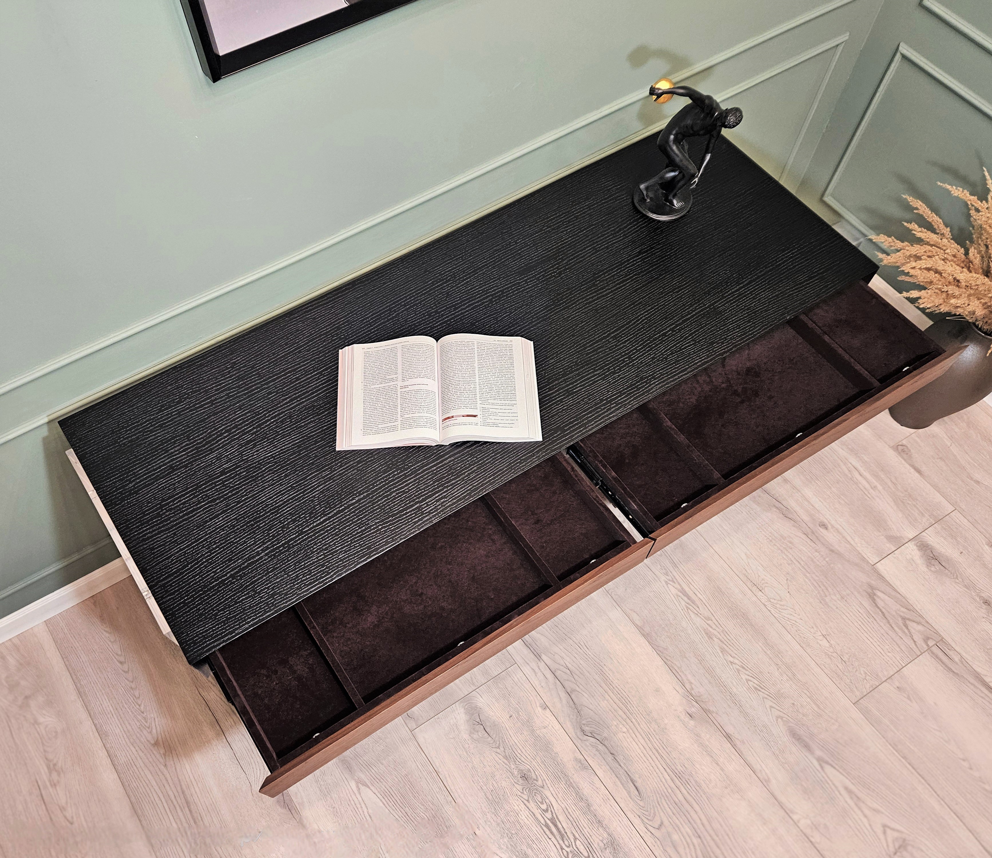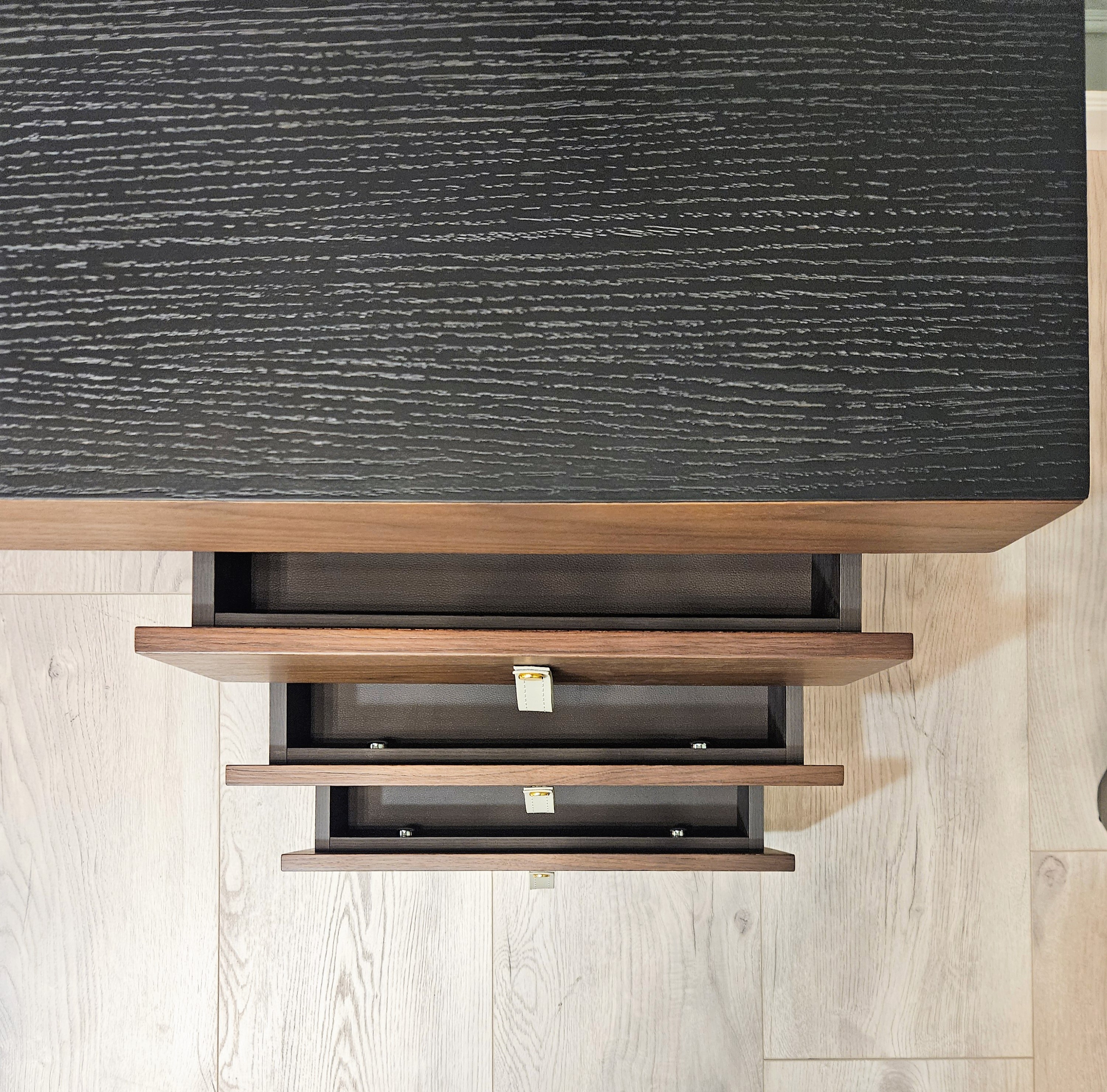 Внутренняя отделка ящиков в столешнице из бархата, цвет кофейный.