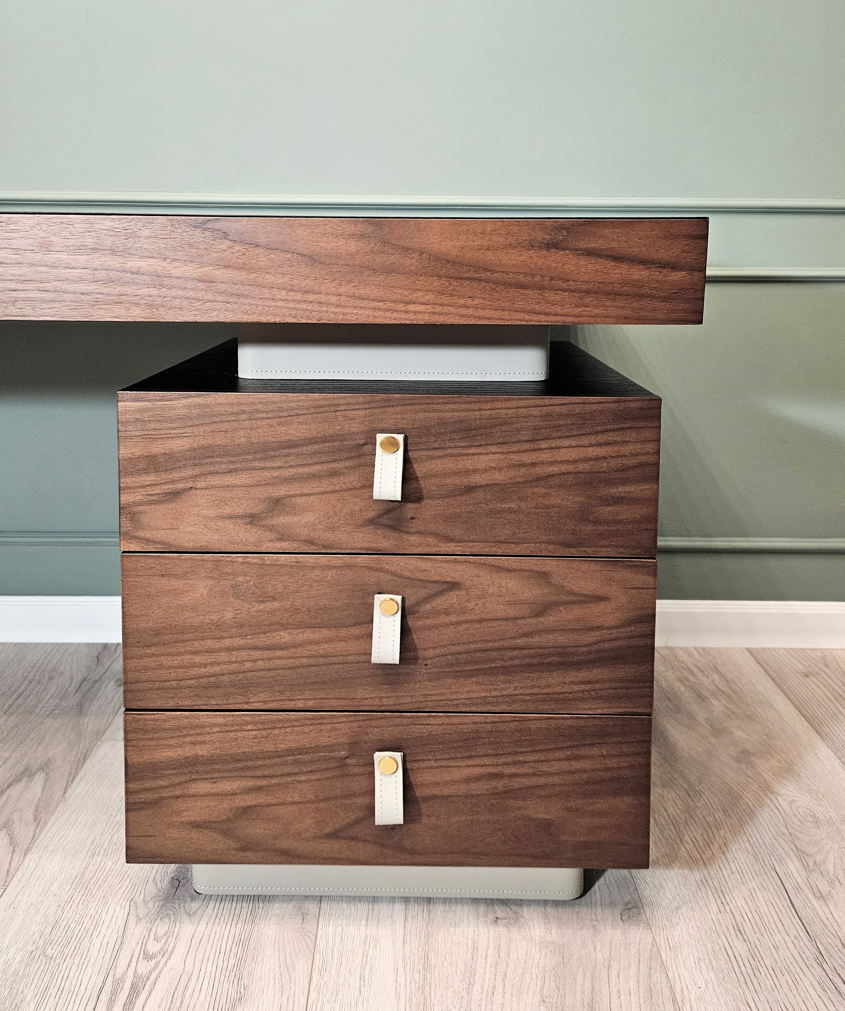 Цоколь, верхняя вставка тумбы и ручки-петли отделаны экокожей, цвет серо-бежевый.