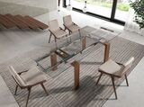 Раскладной обеденный стол Natural от фабрики Angel Cerda — необычный дизайн для творческих людей. Стол очарует и привлечет внимание каждого, кто любит оригинальные предметы интерьера. В этой модели дизайнеры акцентируют внимание на «внутренностях» — раздвижном механизме и деревянном каркасе. Сделанная из закаленного стекла прямоугольная столешница, удлиняется с 160 см до 240 см, благодаря двум дополнительным секциям с обеих сторон (можно раздвинуть только одну сторону). Каркас имеет рамочную конструкцию. Верхние грани поддерживают столешницу, а нижние служат ножками. Такая форма опоры обеспечивает столу хорошую устойчивость и возможность выдерживать высокие весовые нагрузки. Материал изготовления каркаса — натуральное ореховое дерево. Это прочная порода с красивым природным орнаментом. Высота ножек составляет 75 см. При поставке изделия их потребуется прикрутить самостоятельно. Ширина стола составляет 90 см, а вес — 119 кг. В комплекте с данной моделью идет инструкция по сборке и необходимый крепеж.