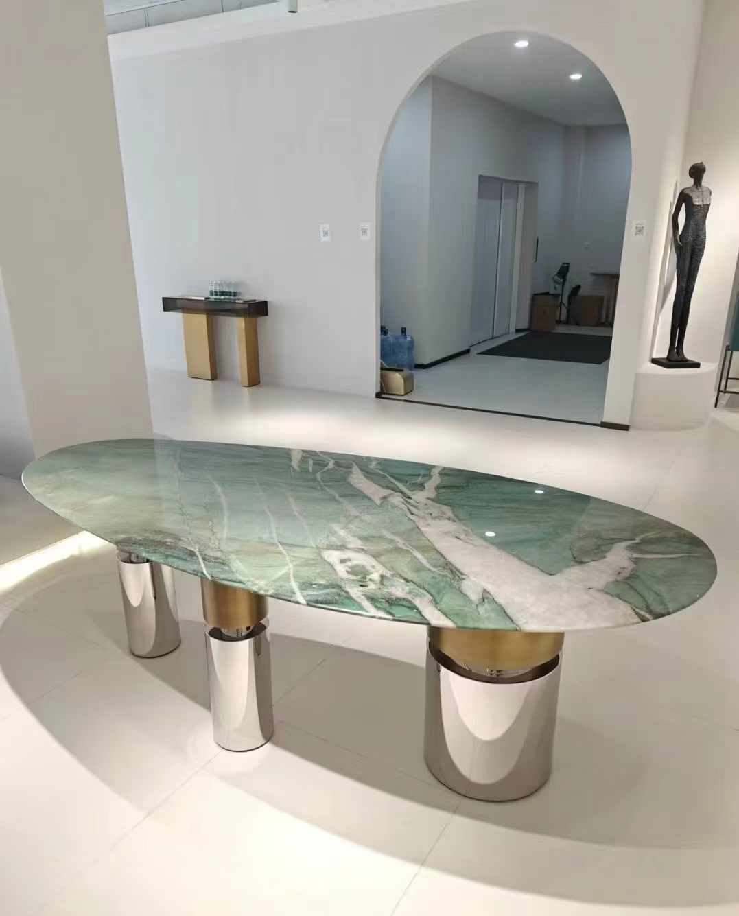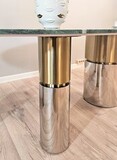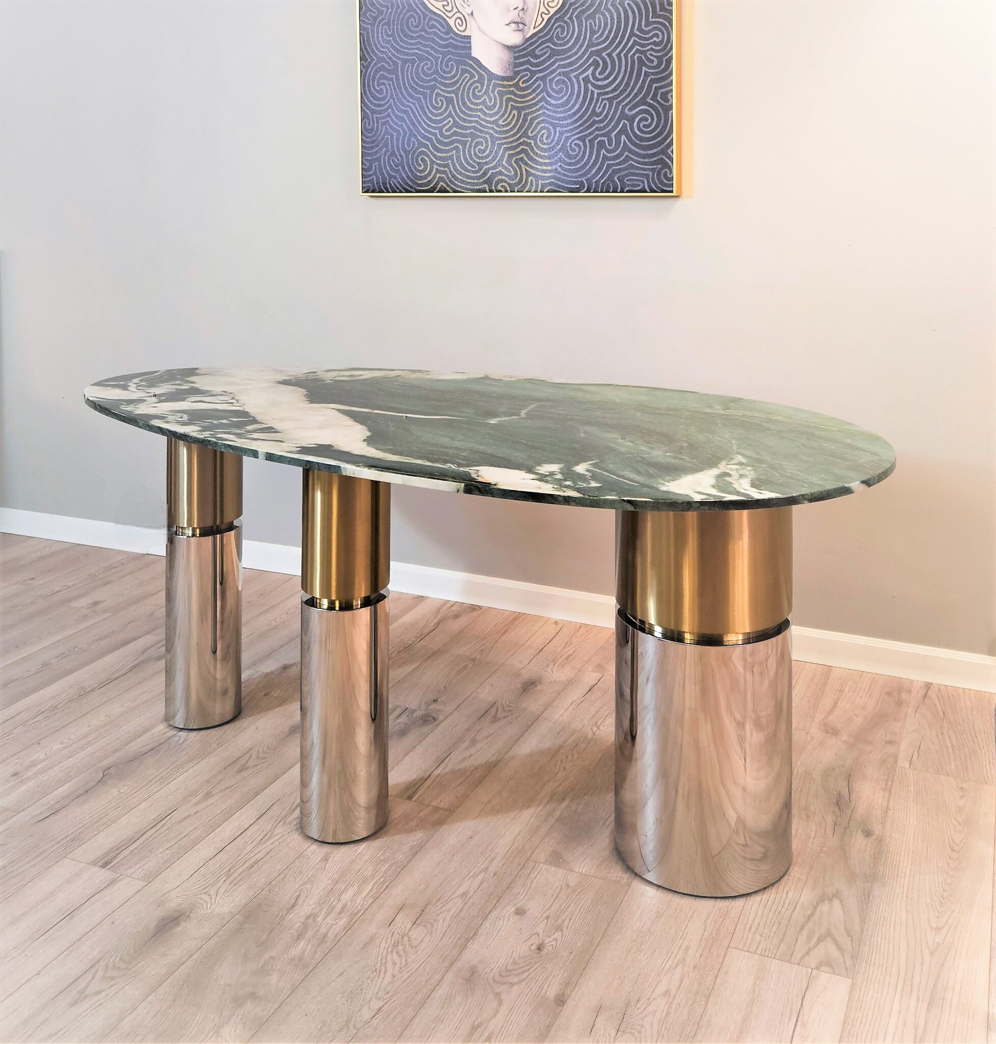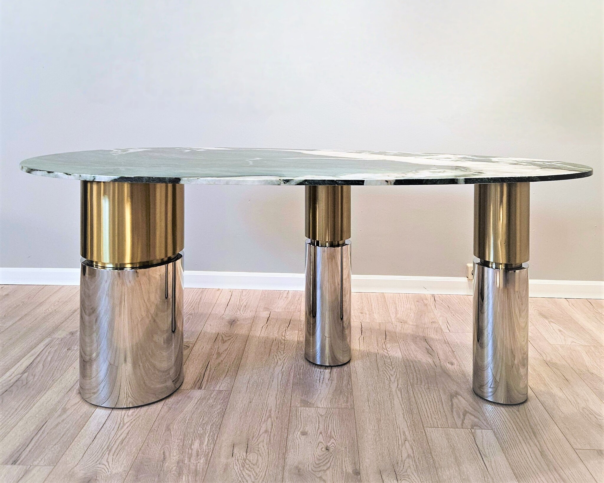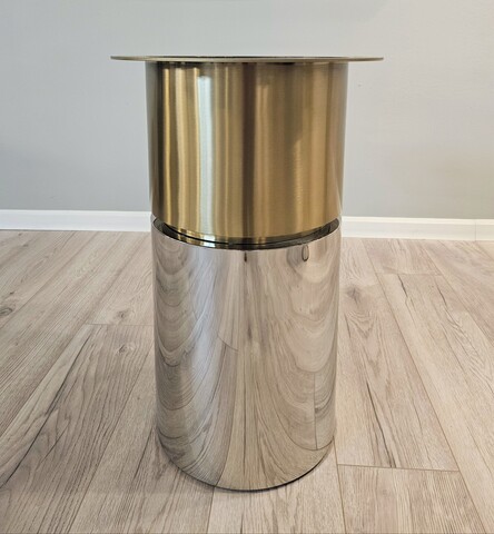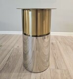 В геометрии трех вертикальных опор гармонично сочетаются матовое золото и блеск хромированного металла.