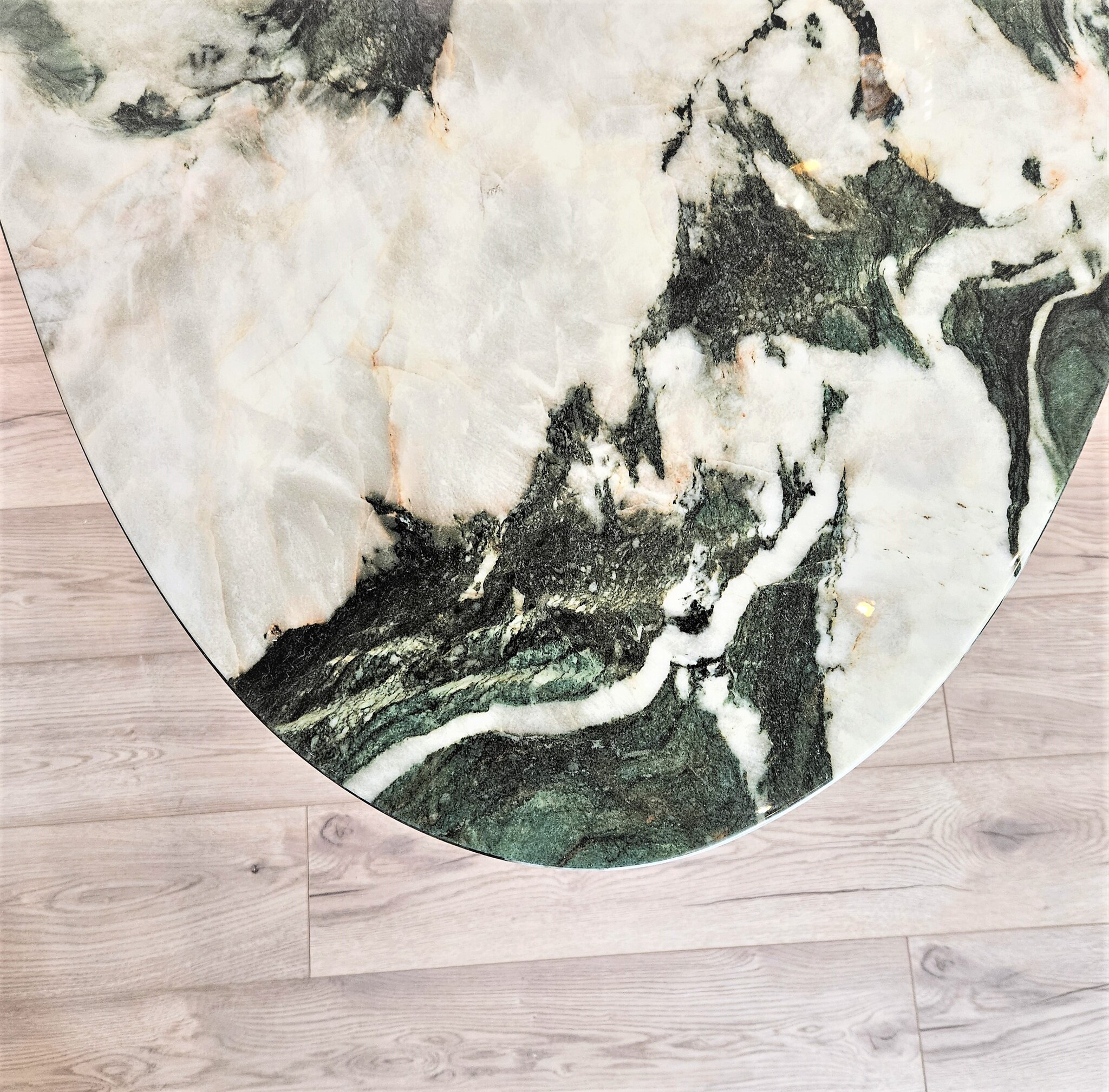 Асимметричная столешница с закругленными углами выполнена из агломерата (композитного камня с мраморной крошкой). Поверхность столешницы глянцевая с полимерным покрытием, цвет - малахит.