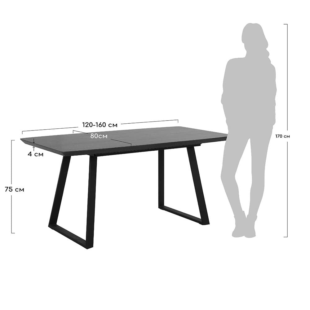 Спецификация: Цвет: столешница серый дуб, ножки чёрные Размер: 120/160 х 80х 75см Длина в сложенном виде: 120см. Длина в разложенном виде: 160см. Толщина столешницы: 40мм. Максимальная нагрузка 80кг В комплекте идёт инструкция и комплект аксессуаров для сборки.