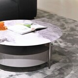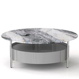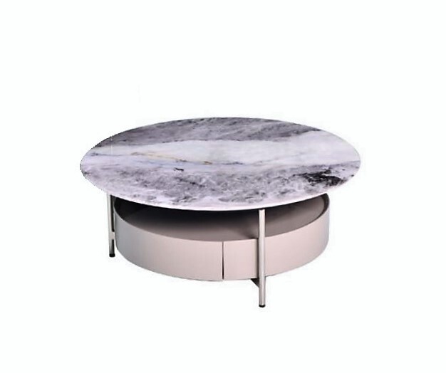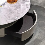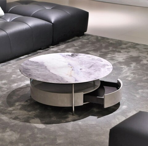 Большой круглый стол из керамогранита сочетает в себе стильную столешницу, удобную открытую полку и практичный выдвижной ящик.