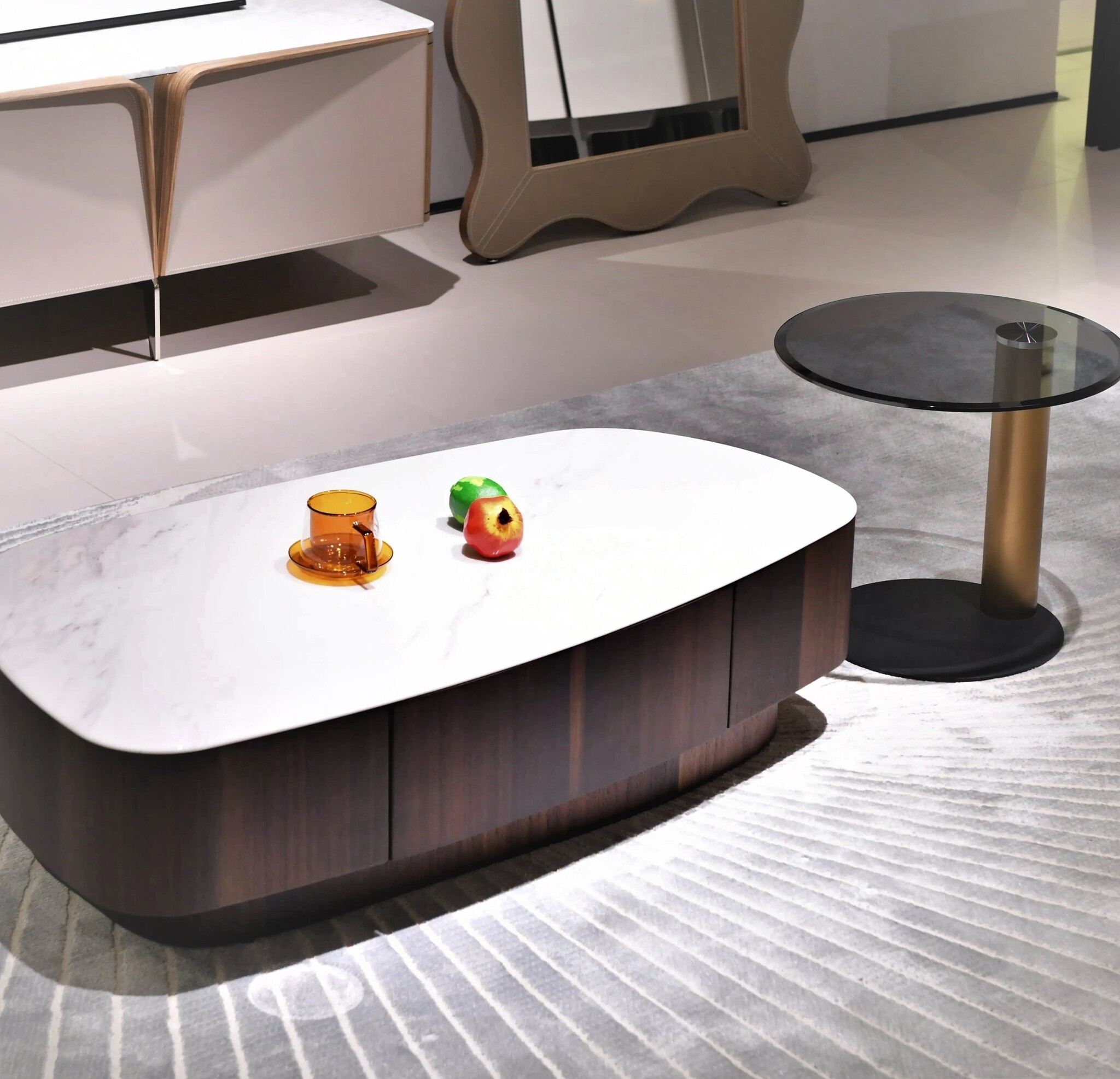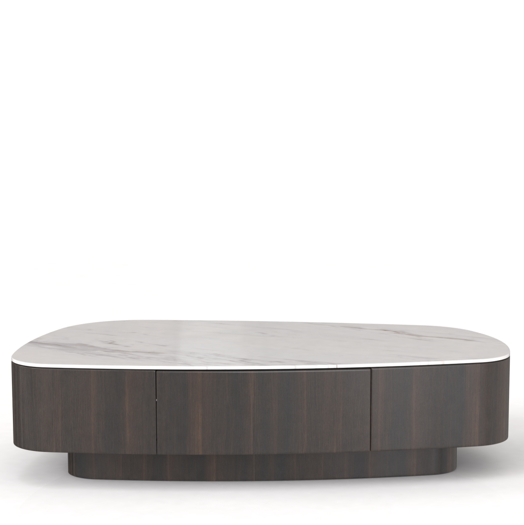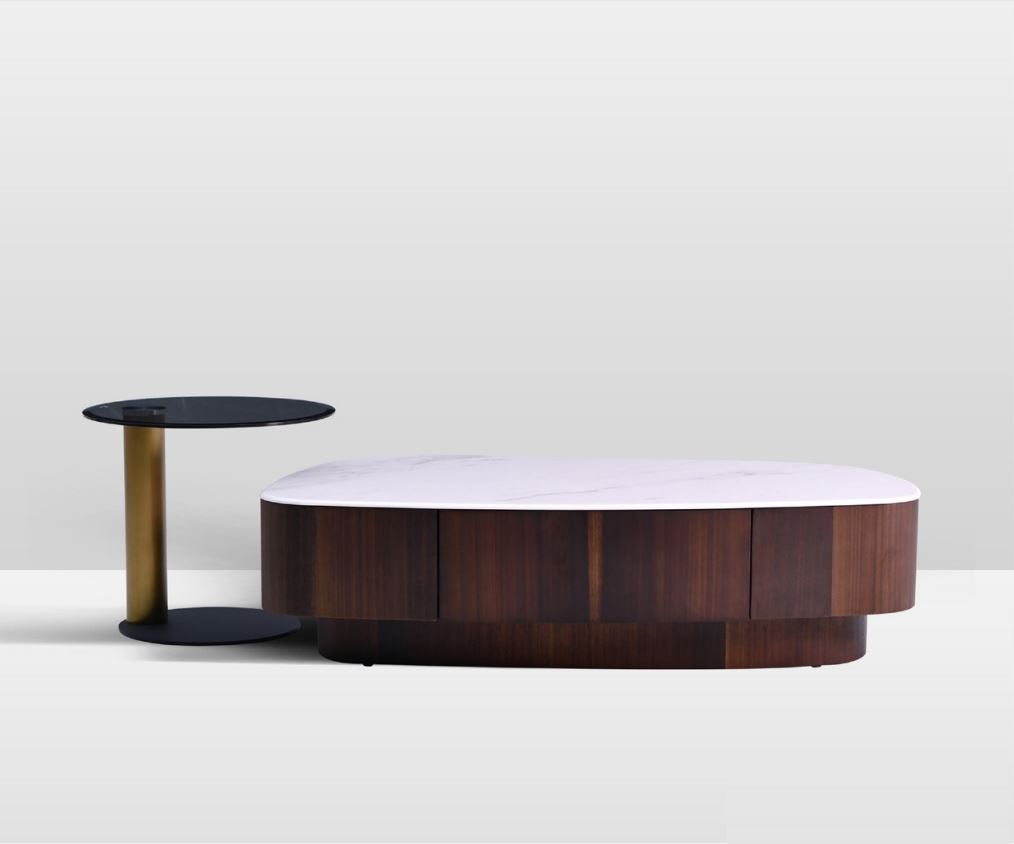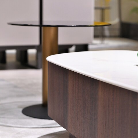 Это элегантное изделие отличается роскошной столешницей с изысканным блеском, которая не требует особого ухода. Асимметричный дизайн столика — смелое решение, привносящее современную эстетику в традиционные интерьеры.