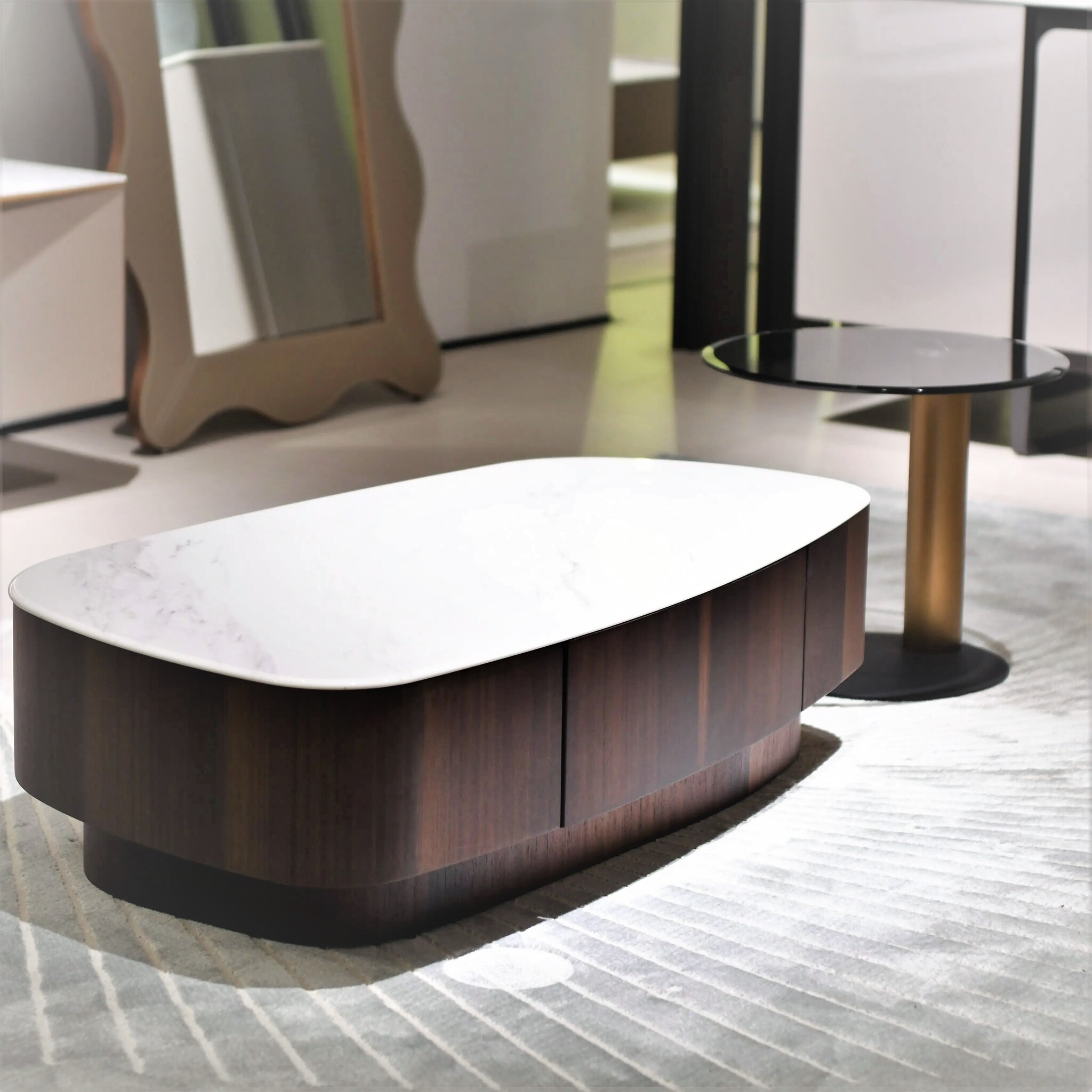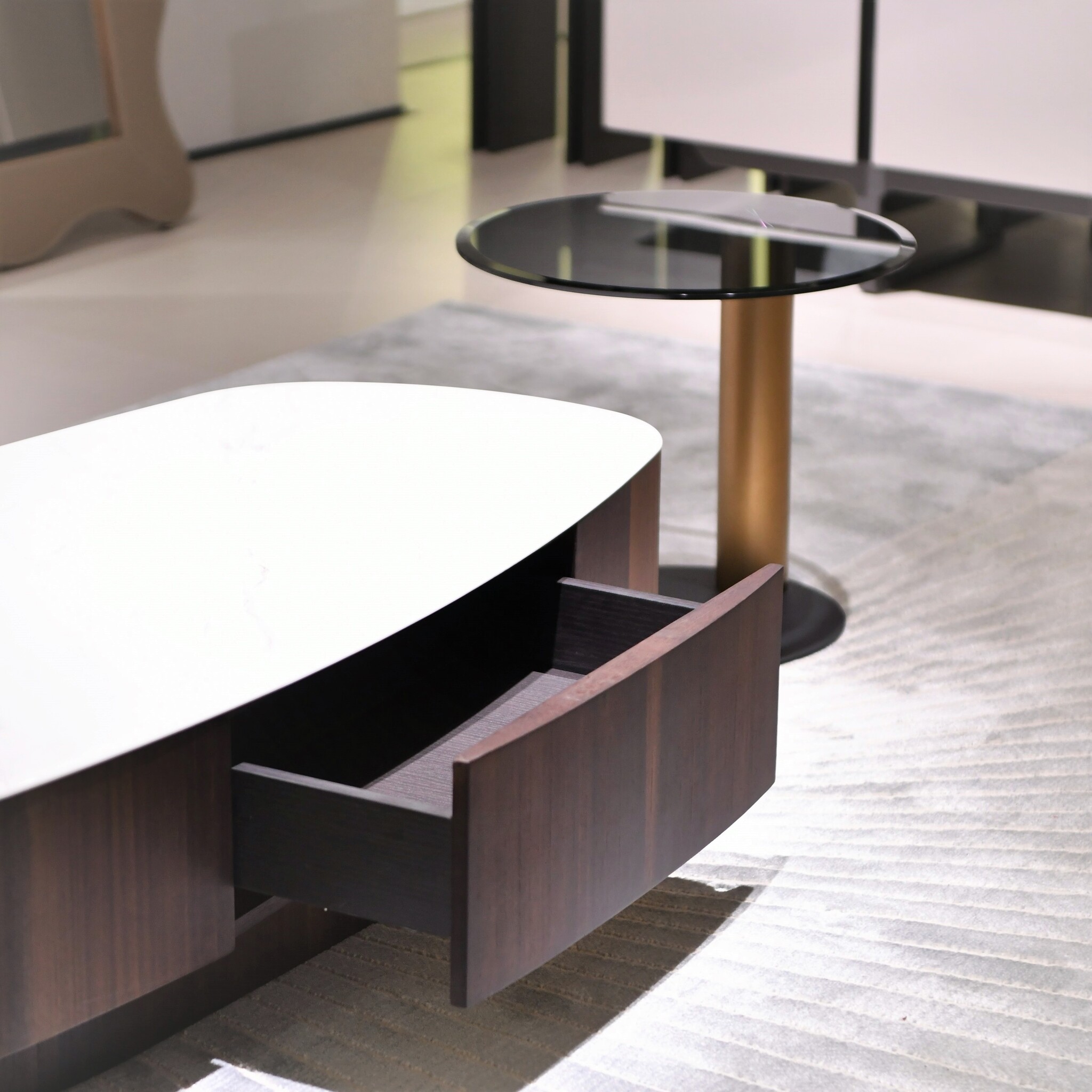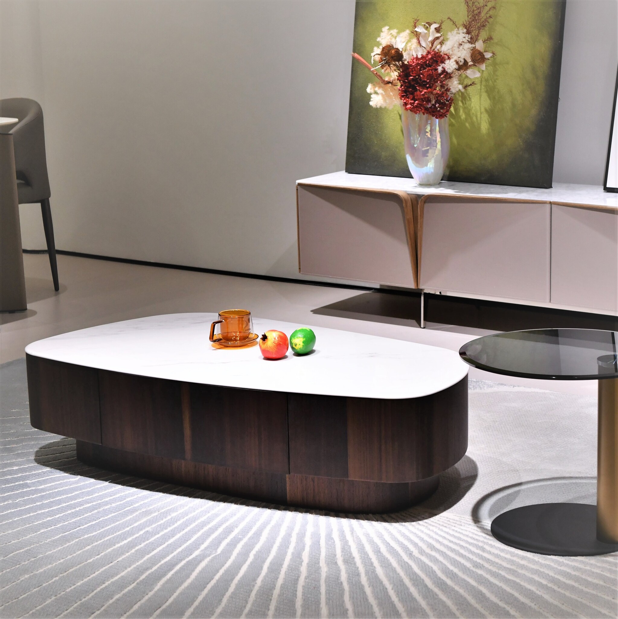 Это элегантное изделие отличается роскошной столешницей с изысканным блеском, которая не требует особого ухода. Асимметричный дизайн столика — смелое решение, привносящее современную эстетику в традиционные интерьеры.