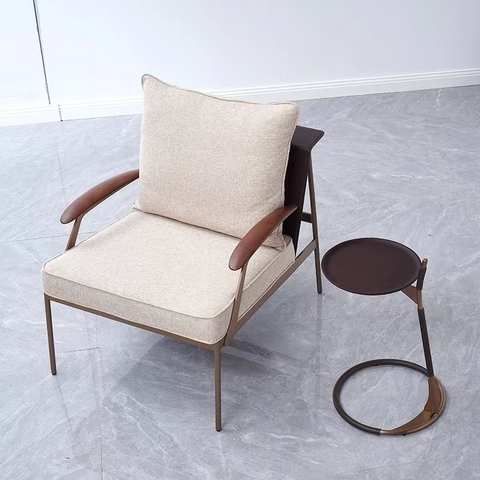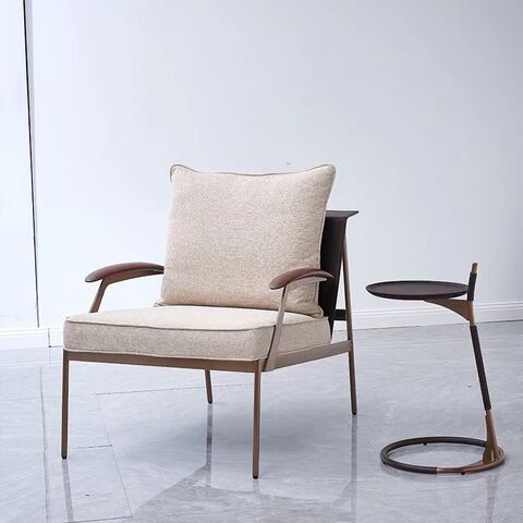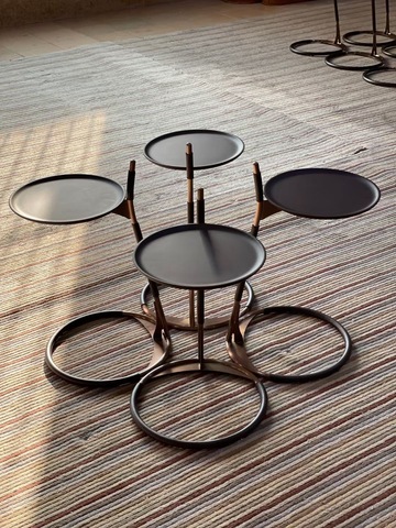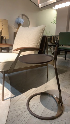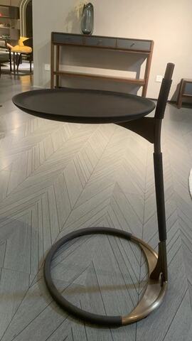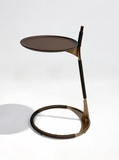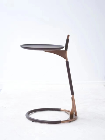 Приставной столик с характерными линиями, круглой столешницей из дерева и тонкой трубчатой конструкцией из нержавеющей стали, частично покрытой толстой кожей с видимой прострочкой. Очень легкий по весу, его легко транспортировать и он идеально впишется в любой интерьер.