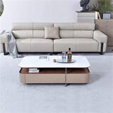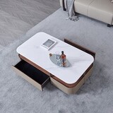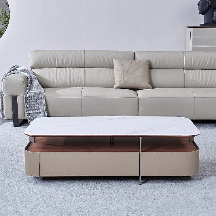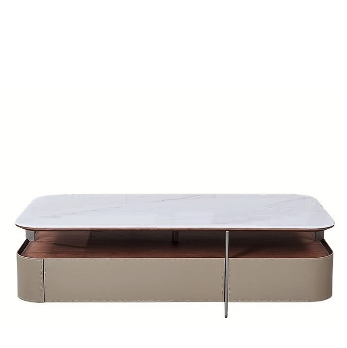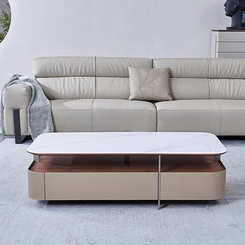 Большой прямоугольный стол из керамогранита сочетает в себе стильную столешницу, удобную открытую полку и практичные выдвижные ящики.