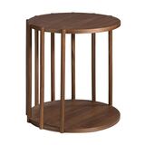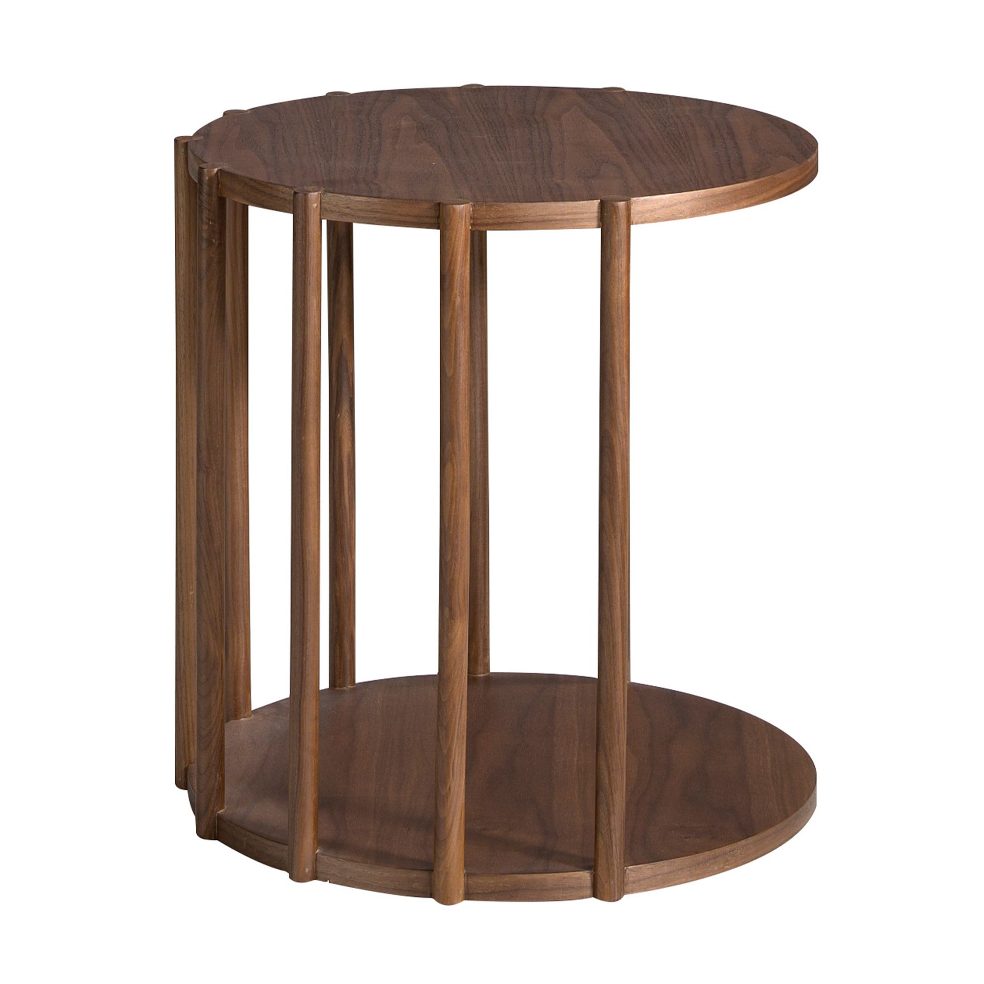 Столик MT1403 от Angel Cerda — непринужденный и универсальный дизайн для размещения в любом месте. Столик очаровывает своим не банальным, и, в то же время, в меру оригинальным исполнением. Взяв за основу реечную конструкцию, дизайнеры не стали более добавлять никаких декоративных элементов. Лаконичная круглая форма, теплый коричневый цвет, дерево — все это черты современной европейской мебели. Поэтому такой компактный и аккуратный предмет найдет себе место в каждой городской квартире. Столик имеет круглую форму и полностью сделан из шпонированного МДФ. Этот материал обладает теми же свойствами, что и дерево — он экологичен, прочен, эстетичен. Цвет орехового дерева — один из наиболее распространенных оттенков, встречаемых в европейском модерне. Конструкционно столик представляет собой два диска, которые соединены между собой круглыми рейками. Они не полностью закрывают межпотолочное пространство, тем самым, позволяя использовать его для размещения книг, журналов и прочих не мелкогабаритных предметов. Столик имеет небольшие габариты, поэтому его удобно эксплуатировать в любом месте — от угла в прихожей, до прикроватной зоны вместо тумбочки. Размеры изделия: длина — 45 см, ширина — 45 см, высота — 47 см. Для помещения предметов внутрь, спереди изделия предусмотрена незакрытая рейками область.