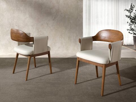 Стул с подлокотниками современного дизайна, обитый кремовым кожзаменителем, и спинкой из дерева орехового цвета. Его деревянные ножки орехового цвета в авангардном, но неподвластном времени стиле сделают его незаменимым предметом мебели для вашей кухни или столовой. Этот стул от Angel Cerdá сочетает в себе уникальный и индивидуальный стиль бренда, а также максимальный комфорт и устойчивость благодаря высокому качеству обивки и оригинальной конструкции ножек.