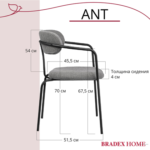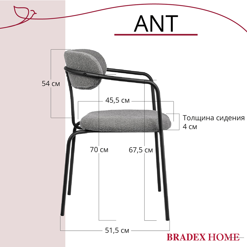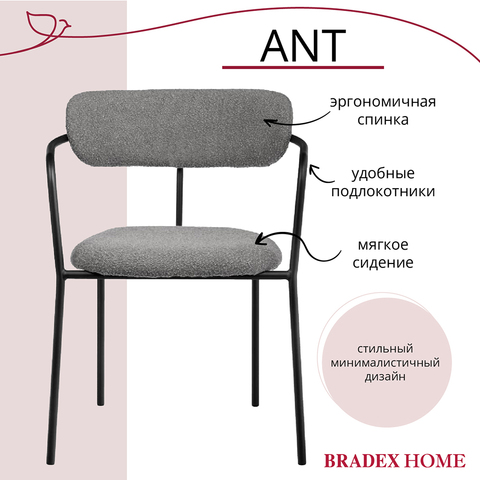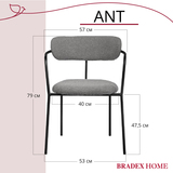 Стулья Ant — это идеальное сочетание стиля и удобства, которое добавит шарм в любую комнату дома или офиса. С их оригинальным дизайном и уникальной конструкцией, эти стулья привлекут внимание и станут центральным элементом интерьера. Стулья Ant представлены в двух видах ткани: Букле: Этот трендовый фактурный материал отличается природными благородными цветами, нежным комфортом и гипоаллергенностью. Букле устойчив к сминанию, не оставляет заломов и складок, легко очищается и хорошо пропускает воздух. Велюр: Для роскошного вида и мягкости, выберите велюр. Эта ткань также обладает высокой устойчивостью к износу, придает стульям элегантный вид и не оставляет зацепок. Износостойкость и комфорт: Стулья Ant изготовлены из высококачественных материалов: Пенополиуретан плотностью 25 кг/м³ сохраняет свою форму и не высыхает со временем. Фанера высокого сорта обеспечивает надёжность и безопасность использования. Металлические ножки диаметром 19 мм и толщиной 1,2 мм гарантируют стабильность и долговечность, выдерживая нагрузку до 150 кг. Стулья Ant обладают эргономичной спинкой, мягким сидением и удобными подлокотниками. Высота спинки 79 см обеспечивает комфортную поддержку, а изысканный минималистичный дизайн с черным металлическим каркасом и ножками придает стульям современный вид. Выбирайте стулья Ant для создания уютного и стильного интерьера, где каждая деталь продумана для вашего комфорта и эстетического удовольствия.