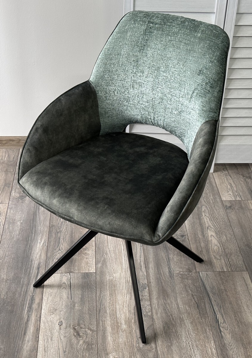 Обивка спинки - фактурный велюр зеленого цвета, сиденья - велюр темно-зеленого цвета.