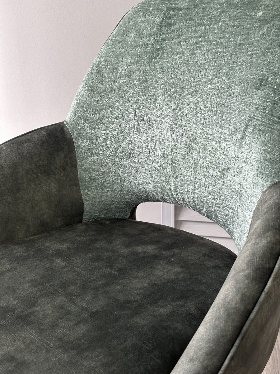 Обивка спинки - фактурный велюр зеленого цвета, сиденья - велюр темно-зеленого цвета.