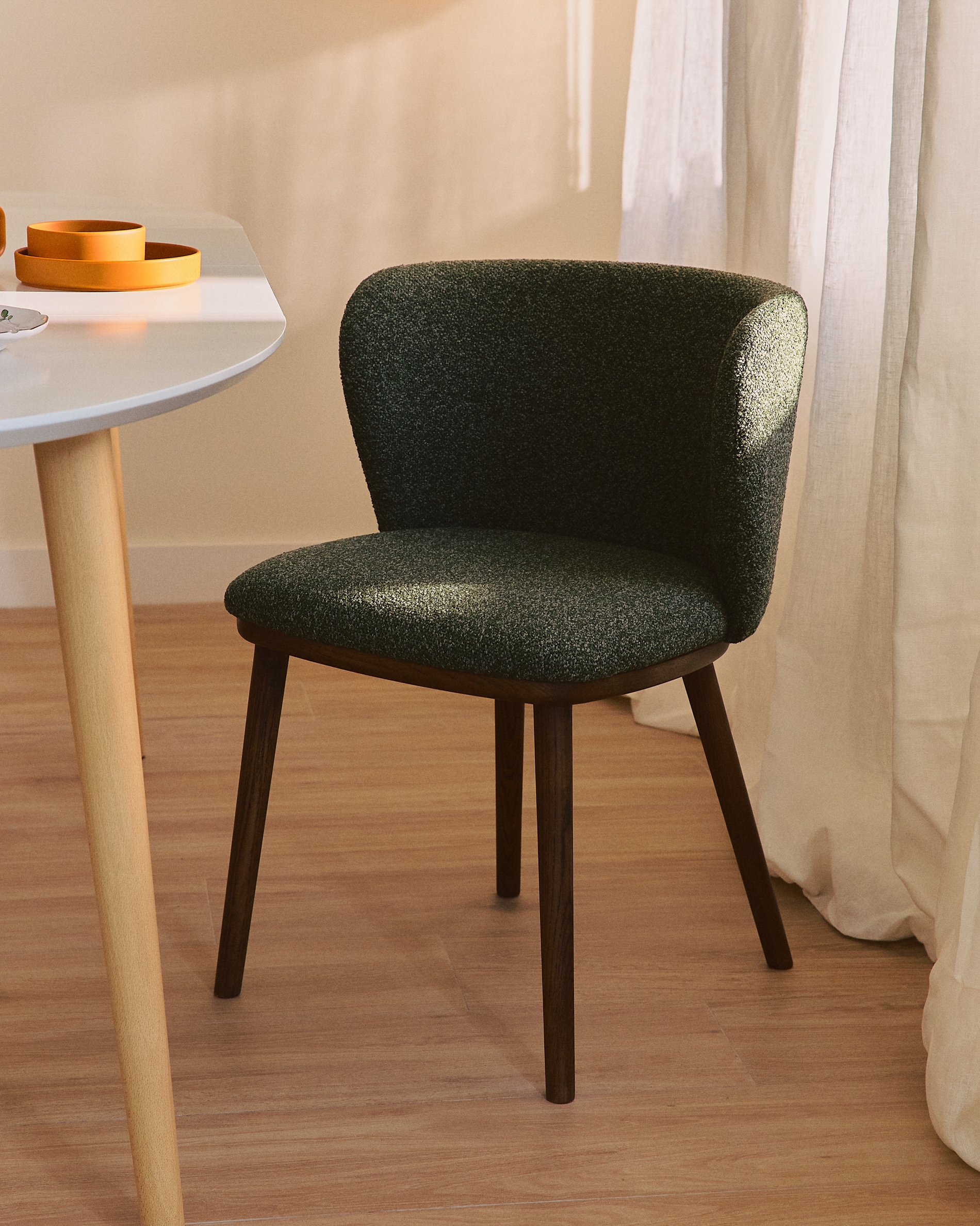 Коллекция стульев Ciselia сочетает в себе комфорт, дизайн и заботу об окружающей среде в изделиях с мягкими современными линиями. Обивка из плотного шенилла имеет бархатистую и прочную текстуру, которая окутывает сиденье уютом. Ножки из массива ясеня с отделкой цвета ореха обеспечивают устойчивость и визуальный баланс, подчёркивая элегантность и вневременной характер стула. Сиденье наполнено пенополиуретаном плотностью 28 кг/м³, что обеспечивает прочность и комфорт в течение длительного времени.