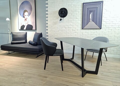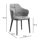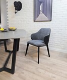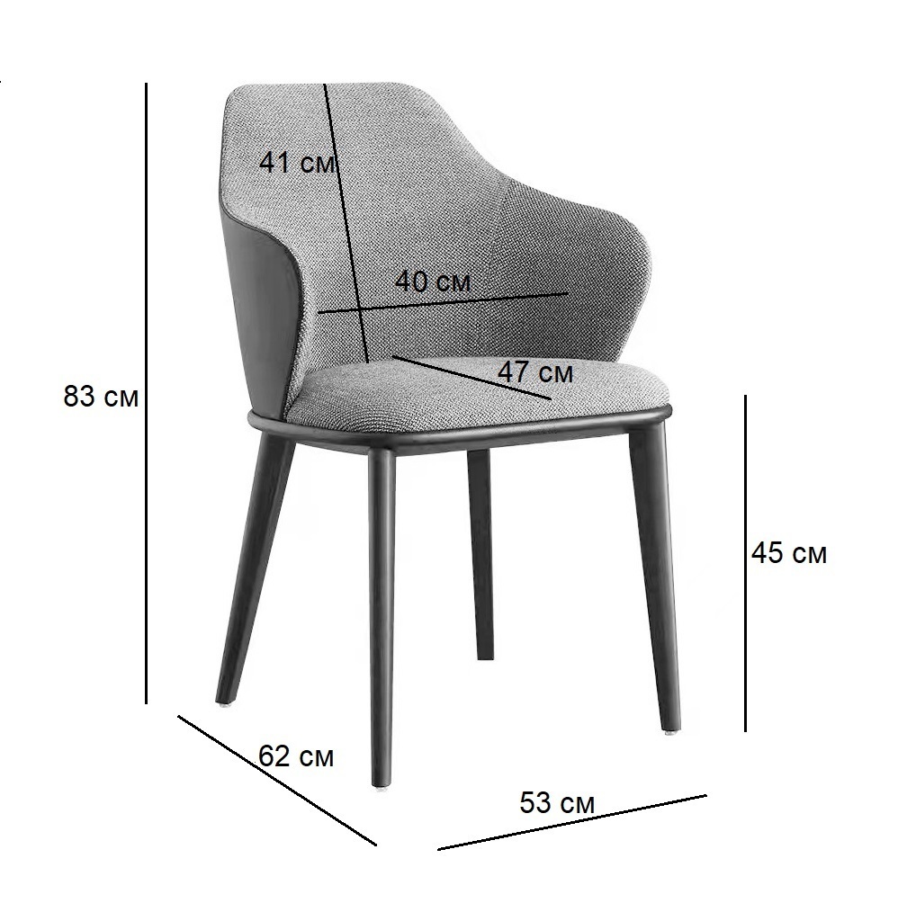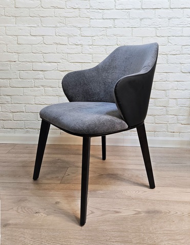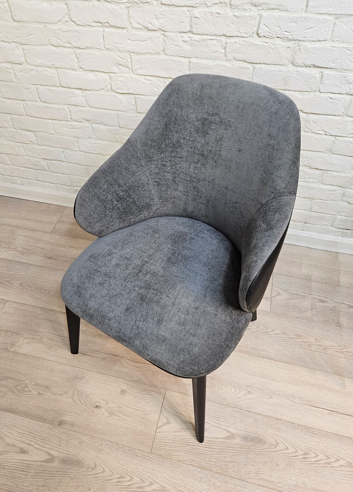 Стул представлен в ткани шенилл серого цвета и в экокоже черного цвета. Ножки из массива дерева черного цвета. Возможны различные варианты ткани и кожи в доступных цветах.