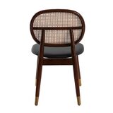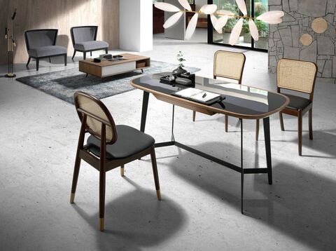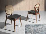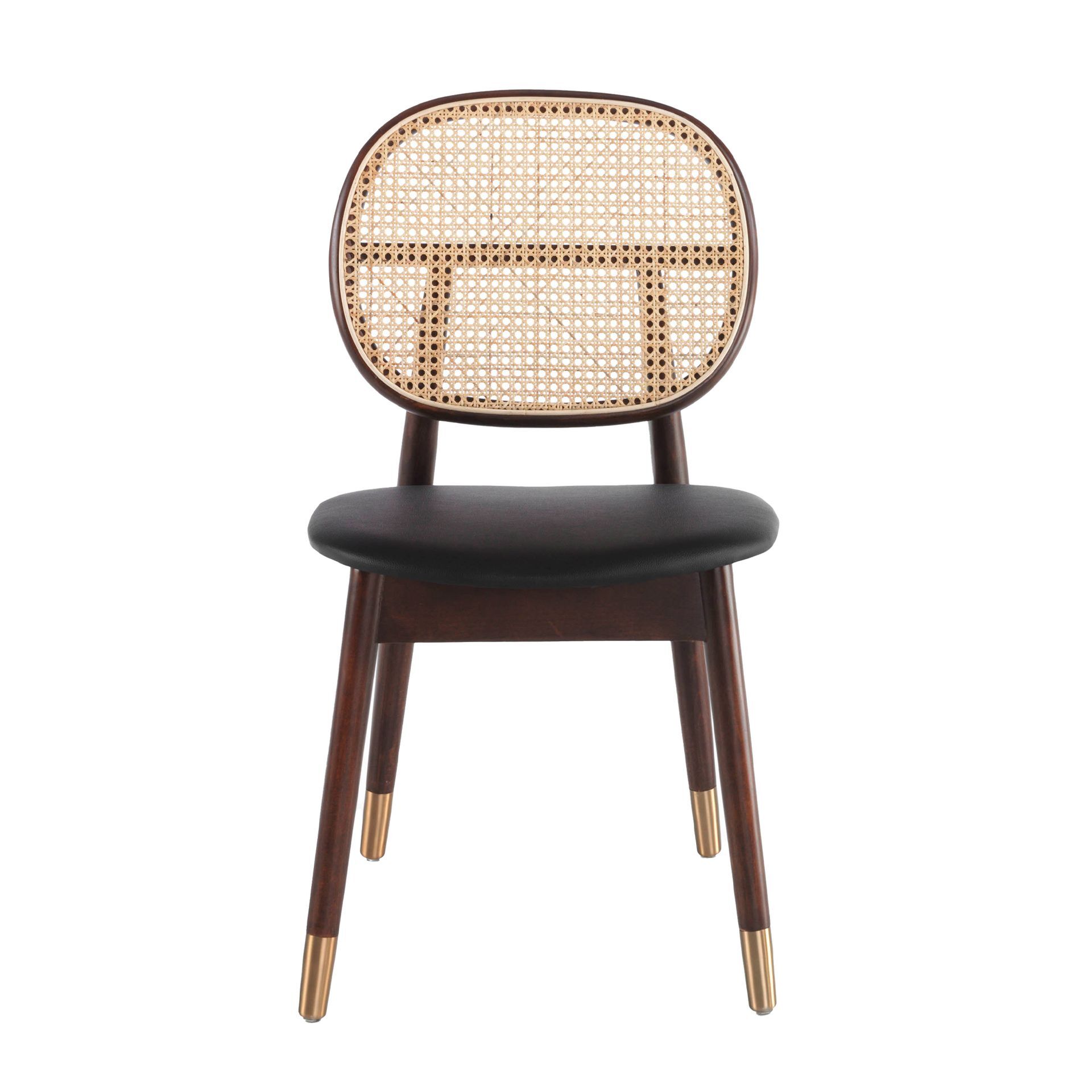 Стул DC1599 от фабрики Angel Cerda – эстетичный дизайн и уникальная спинка. Стул DC1599 бесподобный в своем исполнении. Его эффектный внешний вид во многом обеспечен красотой и уникальностью дерева. Здесь это потрясающий массив ясеня и индивидуальный ротанг. В качестве «вишенки на торте» дизайнерами предложены позолоченные наконечники на ножках. И в завершении, кожаная подушка, без которой удобство было бы неполноценным. Наслаждайтесь видом и комфортом – стул DC1599 сделан для вас! Конструкция стула сделана из массива ясеня, который окрашен в темно-коричневый цвет и покрыт защитным лаком. Спинка вручную сплетена из ротанга, оформлена деревянной рамой. Подушка на сиденье черного цвета, сшита из искусственной кожи. Она набита синтетической пеной, неприхотливая в уходе. Плотность пены – 25 кг/м3. Наконечники на ножках металлические, с золотым гальваническим покрытием. Они не тускнеют, стойкие к механическим воздействиям. Снизу предусмотрены накладки, которые не повреждают напольное покрытие. Максимальная весовая нагрузка на стул не должна превышать 130 кг. Размеры: ширина – 49 см, высота – 87 см, глубина – 52 см. Вес изделия – 8 кг. Стул предназначен только для домашнего использования. Сборка не предусмотрена. Экокожа - Similar Acua 90.