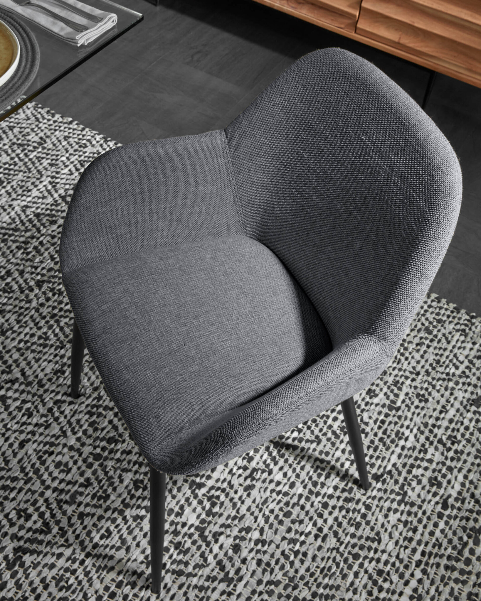 Кресло Konna из одноименной коллекции от фабрики La Forma (ex Julia Grup). Кресло завораживает своей простотой и изяществом. Здесь взгляд останавливает не буйство красок и элементов декора, а продуманная функциональность и универсальный дизайн. Любители урбанистического стиля без излишеств, этот стул для вас. Чтобы поставить эту модель в квартиру, не навредив интерьеру, придумывать ничего не нужно. Стул прекрасно впишется в гостиную, выполненную в современном европейском стиле, где главное правило — стиль и функциональность. Универсальная цветовая гамма — это еще один плюс к тому, что изделие лаконично встанет в помещении с любым цветом интерьера. Конструкция проста до предела — это цельное сиденье, состоящее из спинки, бортиков и подушки, и металлический каркас из четырех ножек, обеспечивающий прочность и устойчивость. Ножки окрашены порошковой краской в черный цвет. Несмотря на «тяжесть» материала изготовления, их форма изящная и абсолютно не придает изделию громоздкий вид. Материал обивки сиденья — прочный текстиль.Эта ткань обладает высокой степенью износостойкости и приятная на ощупь (при чистке использование отбеливателей и абразивных веществ запрещено). Размеры — 59 см×83 см×52 см (ширина, высота, глубина). Вес — 6,6 кг. В коллекции Konna эта модель представлена в четырех цветах: темно-сером, горчичном, голубом и сером цветах.