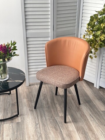 Комбинированная обивка: сиденье - рогожка коричневого цвета, спинка - экокожа оранжевого цвета.