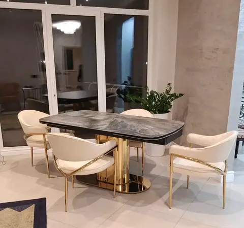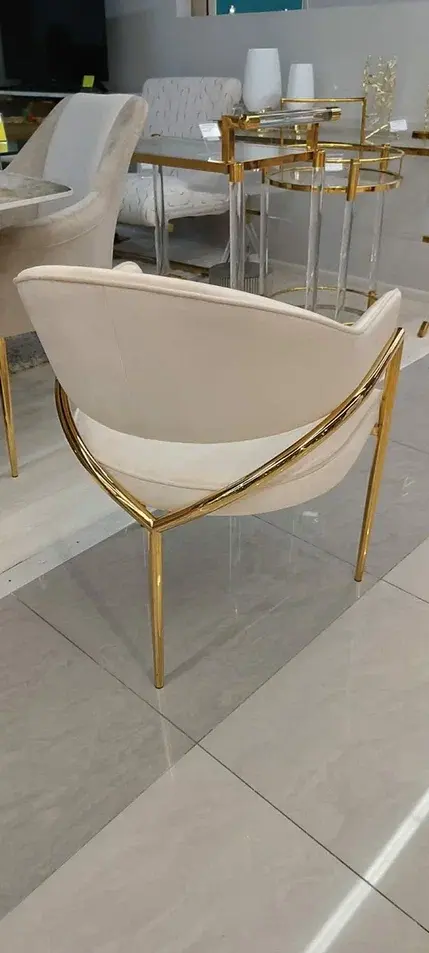 Дизайнерский мягкий обеденный стул со спинкой в современном стиле, с обивкой из бежевого велюра и золотым металлическим каркасом Стул обеденный Модена MC886-BG-2 — это сочетание элегантного дизайна, комфорта и долговечности. Этот обеденный дизайнерский стул идеально подходит как для домашней столовой, так и для уютного кафе или ресторана. Модель выполнена с акцентом на комфорт: мягкий обеденный стул со спинкой в современном стиле имеет удобную анатомическую форму, обеспечивающую оптимальную поддержку спины. Обивка изготовлена из высококачественного бежевого велюра, который придает изделию роскошный внешний вид и приятен на ощупь. Каркас стула в виде трехножной конструкции выполнен из нержавеющей стали с покрытием глянцевое золото, что делает его не только устойчивым к нагрузкам, но и стильным элементом интерьера. Цветовая гамма — нежный бежевый и яркое золото — создает гармоничное сочетание, подходящее как для светлых, так и для теплых интерьеров. Размеры 59×61×79 см обеспечивают компактность и удобство размещения даже в небольших помещениях. Стул сделан из износостойких материалов, выдерживает значительные нагрузки и сохраняет свой внешний вид даже при интенсивной эксплуатации. Этот обеденный стул станет прекрасным дополнением к любому столу в стиле минимализм, гламур или современная классика. Сиденье и спинка: велюр. Ножки: нержавеющая сталь с глянцевым "золотым" покрытием. Цвет: бежевый 2шт/1кор 685*650*670 см Гарантия 1 год
