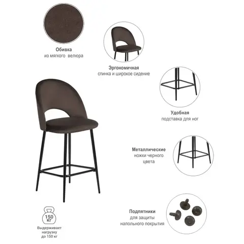 Спецификация: Стул полубарный на разборном металлическом каркасе. Обивка из износостойкого мебельного велюра устойчива к истиранию. Размер: 49x52x101см Глубина сиденья 44 см. Высота сиденья 65 см. Расстояние между передними ножками 35 см Расстояние между передней и задней ножкой 42 см Высота подножки 22см Вес стула 7,5 кг Максимальная нагрузка 120 кг. Поставляется в разобранном виде.