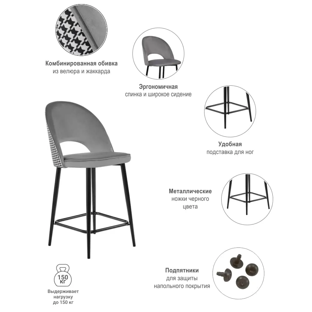 Спецификация: Стул на удобном металлическом сварном каркасе полубарной высоты с поворотным механизмом. Обивка в комбинации жаккарда и износостойкого мебельного велюра устойчива к истиранию. Поставляется в разобранном виде. Ширина 49 см. Глубина 53 см. Высота 101 см. Вес стула 7,5 кг. Максимальная нагрузка 120 кг.