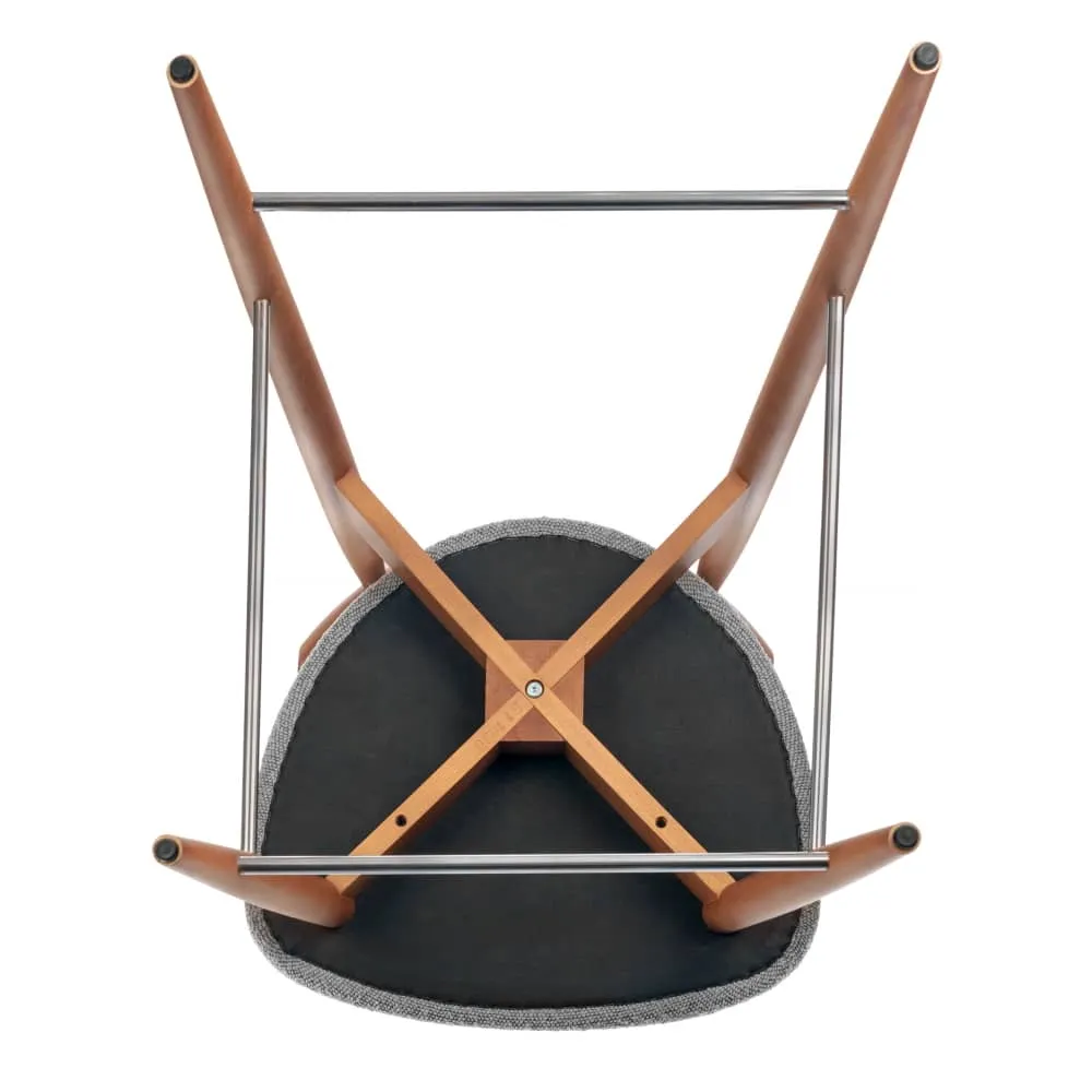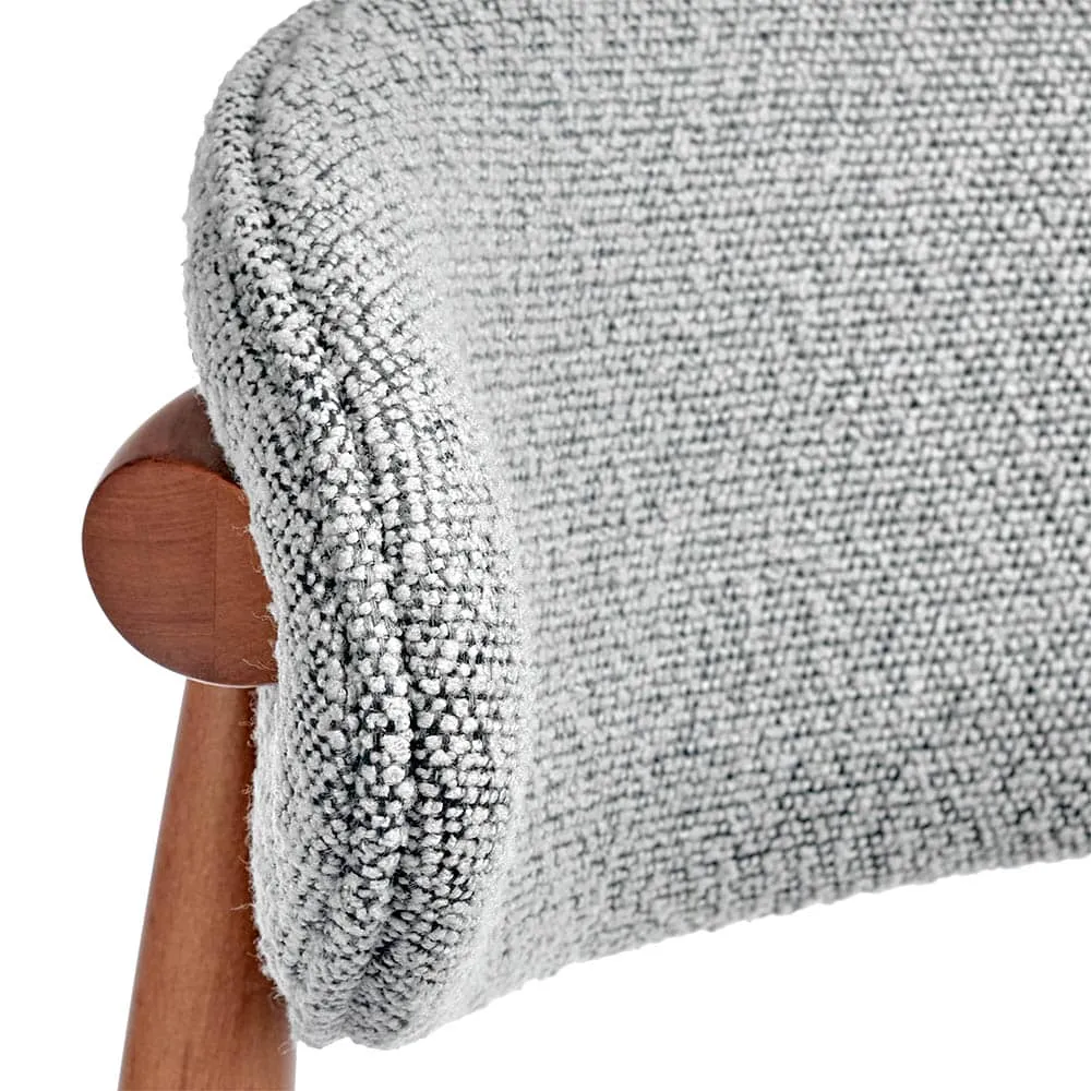 Сиденье и спинка изготовлены из высокоустойчивой ткани букле в светло-сером оттенке. Мягкие спинка и сидение обеспечивают максимальный комфорт. Оригинальный каркас из массива натурального дерева в цвете орех добавляет стулу элегантность. Мелкая структура дерева образует удивительно гладкую поверхность, придающую стулу особый шарм.