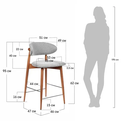 Полубарный стул имеет удобную высоту и выдерживает нагрузку до 120 кг, обеспечивая надежность и долговечность.
