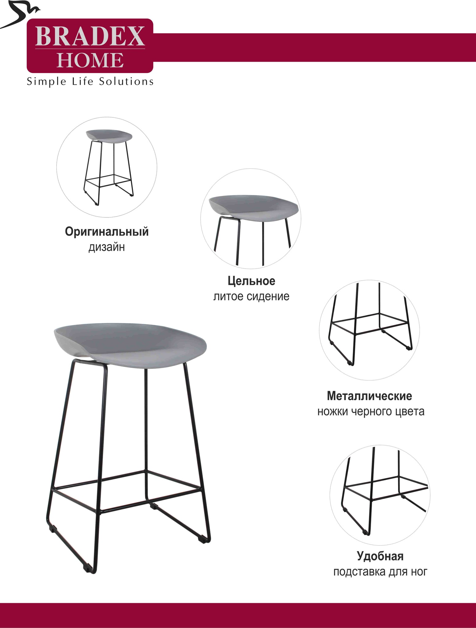 Спецификация: Материал сиденья: полипропилен Материал ножек: металл Размер: 43x47x71см Высота сиденья 61,5см. Вес: 5кг Максимальная нагрузка: 150кг