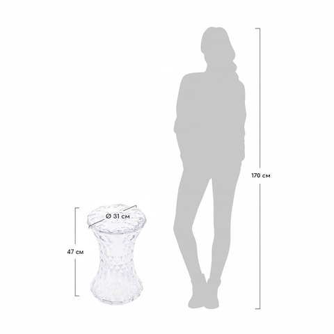 Спецификация: Стул-пуф изготовлен из прозрачного поликарбоната. Благодаря большой цветовой гамме этот стул подчеркнет индивидуальный стиль любого интерьера. Материал: поликарбонат. Температурный режим: -5 +40 градусов Цельсия, избегать дождя и прямых солнечных лучей. Размеры, см: Ш31хГ31хВ46см Вес: 3кг Максимальная нагрузка: 120 кг. Поставляется в собранном виде.