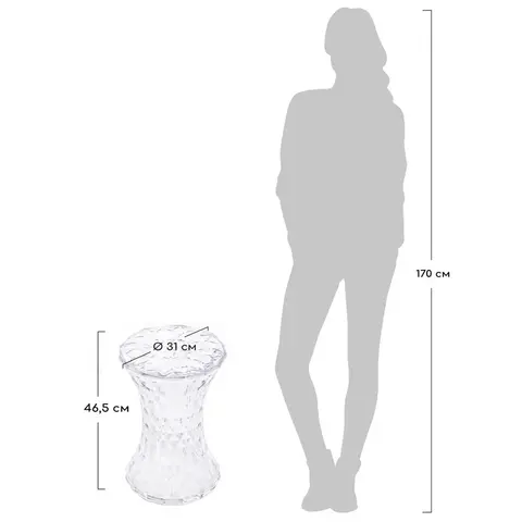 Спецификация: Стул-пуф изготовлен из прозрачного поликарбоната. Благодаря большой цветовой гамме этот стул подчеркнет индивидуальный стиль любого интерьера. Материал: поликарбонат. Температурный режим: -5 +40 градусов Цельсия, избегать дождя и прямых солнечных лучей. Размеры, см: Ш31хГ31хВ46см Вес: 3кг Максимальная нагрузка: 120 кг. Поставляется в собранном виде.