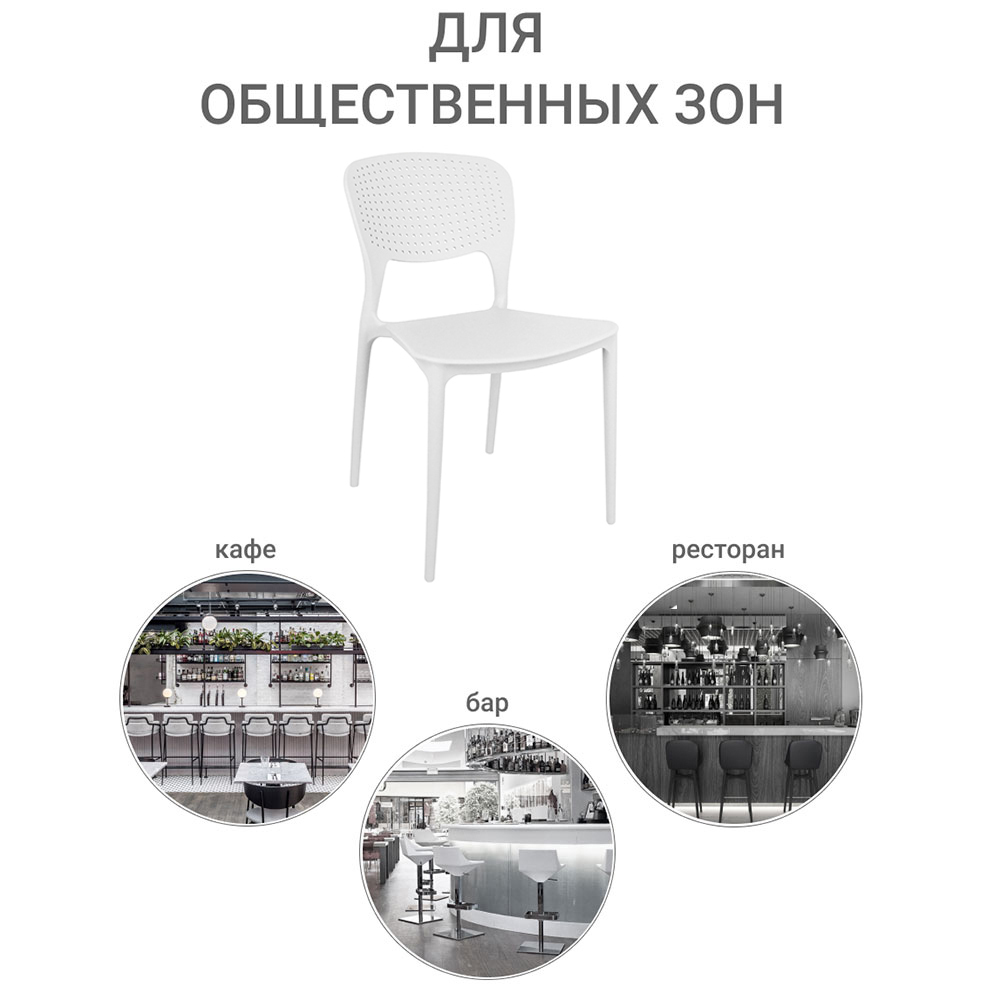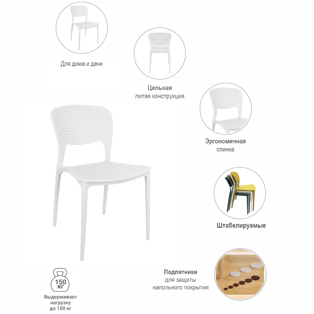 Спецификация: Материал сиденья: полипропилен. Материал ножек: полипропилен Цвет: белый Максимальная нагрузка: 150 кг. Срок службы: 3 года Срок гарантии: 1 год. ДЕКЛАРАЦИЯ О СООТВЕТСТВИИ ЕАЭС N RU Д-CN.СП29.В.07060/19 до 22.01.2024