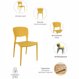 Спецификация: Материал сиденья: полипропилен. Материал ножек: полипропилен Цвет: горчичный Максимальная нагрузка: 150 кг. Срок службы: 3 года Срок гарантии: 1 год. ДЕКЛАРАЦИЯ О СООТВЕТСТВИИ ЕАЭС N RU Д-CN.СП29.В.07060/19 до 22.01.2024