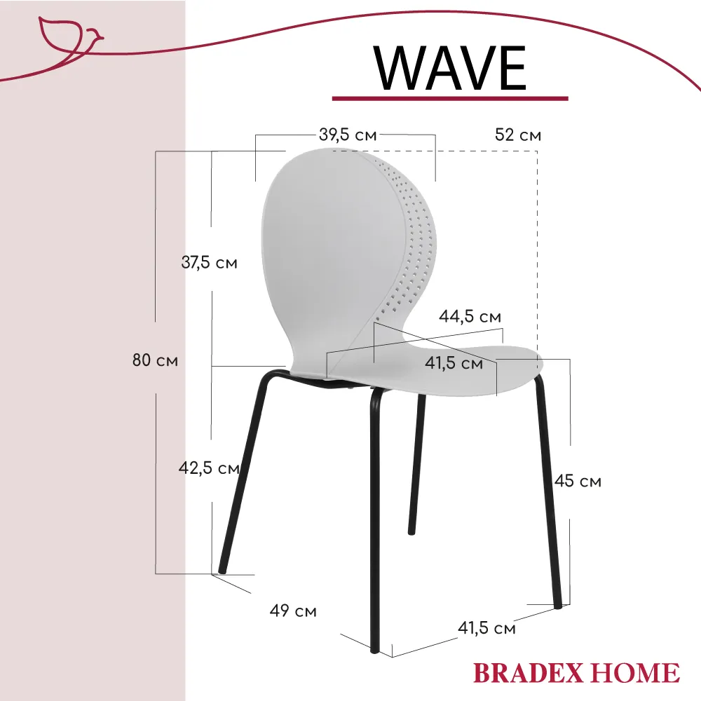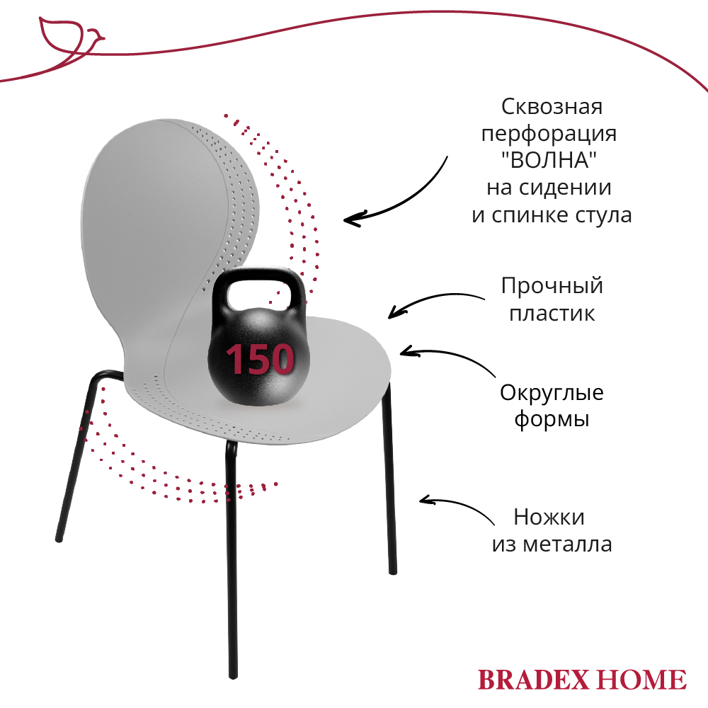 Стул элегантного дизайна, подчеркивающий сочетание современных материалов и утонченного стиля. Его металлические ножки придают конструкции прочность и устойчивость, обеспечивая надежность даже при интенсивном использовании. Цельнолитое пластиковое сиденье с плавными формами, создаёт комфортное пространство для посадки. Особенностью изделия является изящная перфорация по краям спинки и сиденья, придающая легкости общему облику и привлекающая внимание своей необычной декоративностью. Этот стул станет прекрасным дополнением интерьера, сочетающего минимализм и современность, гармонично вписываясь в любую обстановку и подчеркивая вкус владельца.