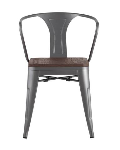 Стул Stool Group TOLIX с подлокотниками серебристый матовый + темное дерево, металлическое серебристое основание, оцинкованный металл с порошковым напылением, сиденье из натурального дерева