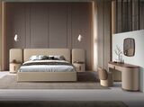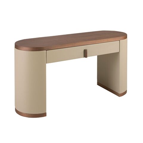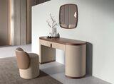 Туалетный столик современного дизайна из натурального орехового шпона в сочетании с элегантной обивкой из искусственной кожи цвета норки. Дизайн ножек, обитых искусственной кожей цвета норки, добавит изысканности и эксклюзивности вашему интерьеру. Благодаря вместительному отделению для хранения с одним ящиком, открывающимся с помощью язычка и доводчика, он позволяет хранить вещи аккуратно и на своих местах.