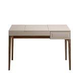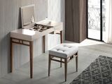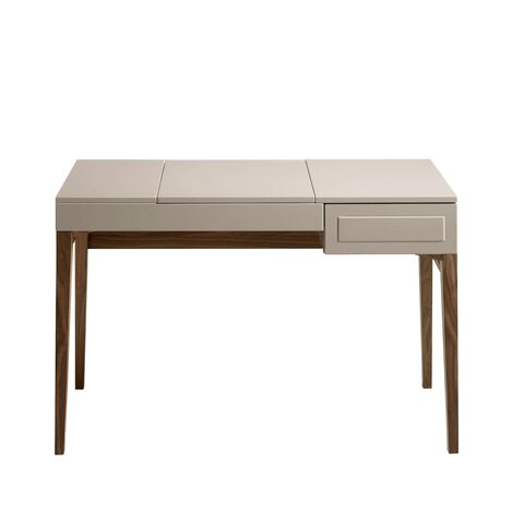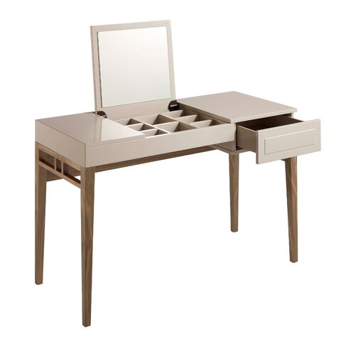 Туалетный столик CP1709DK от компании Angel Cerda — незаменимый предмет интерьера для дамской комнаты. Столик влюбляет в себя с первой секунды. Аккуратная и грациозная форма, небольшие габариты, зеркало и масса отделений для хранения женских мелочей. Это настоящая шкатулка, которая таит в себе все женские секреты. Она будет верным другом для любой женщины. Стол выполнен в современном стиле. Конструкционно он представляет собой столешницу и стойку. Материал изготовления столешницы — лакированный МДФ серо-перламутрового цвета. Справа находится выдвижной ящик, а в центре спрятано зеркало (устроено по принципу открывания шкатулки). В центральной части стола предусмотрено восемь отделений для хранения аксессуаров или косметики. Благодаря такой сборной конструкции, столик легко привести в порядок — достаточно сложить в отделения предметы красоты и закрыть крышку. Стойка сделана из орехового шпона. Длинные ножки имеют конусообразную форму и подпирают столешницу с каждого угла. Вдоль боковых граней имеются поперечные перекладины. Они делают стойку более надежной и являются ненавязчивым предметом декора. Размеры изделия — 120 см х 76 см х 50 см (длина, высота, глубина). Стойку потребуется прикрутить самостоятельно (инструкция и крепеж входят в комплектацию). Отделка - лак RAL7044 Niebla Brillo.