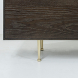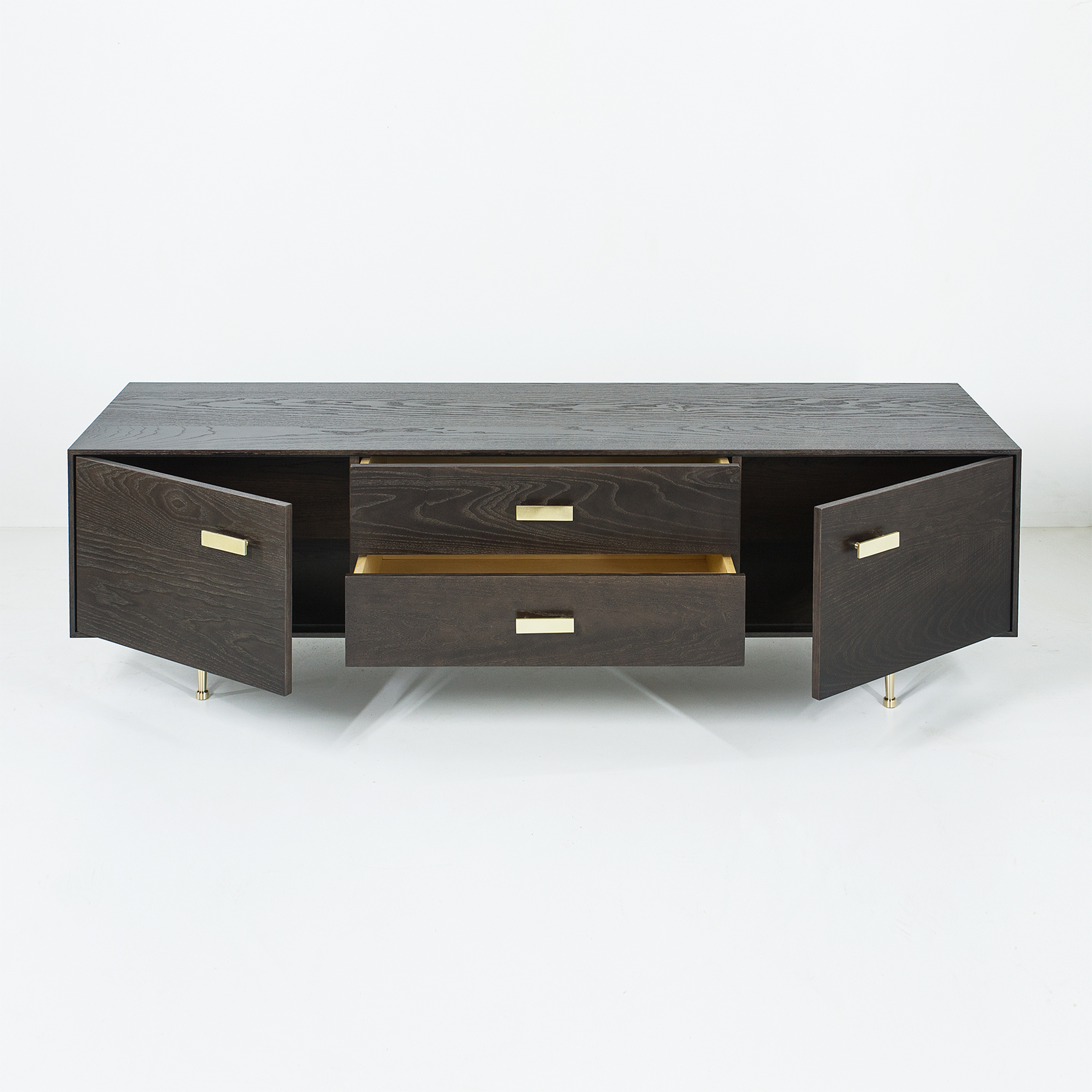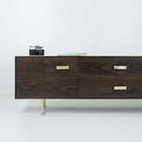 Поверхность обработана легкой патиной для проявления естественной текстуры древесины. Точеные ножки и ручки из латуни дополняют образ изделия. Материалы: МДФ, шпон ясеня, морилка, патина, полуматовый лак; ящики - массив ясеня, фанера, бесцветное минеральное масло; декоративная фурнитура - латунь. Фурнитура - направляющие скрытого типа и петли с доводчиками. Конфигурация: 2 ящика / 2 двери. Изделие поставляется в собранном виде.