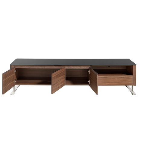 Тумба под ТВ 191-F от фабрики Angel Cerda — гармоничное сочетание трех материалов в современном предмете мебели. Тумба моментально убеждает в том, что достойна находиться в доме, где мебель соответствует самым высоким требованиям. Эта модель создана из натурального шпона, имеет продуманную и надежную конструкцию, в полной мере соответствует современному стилю. Данная тумба под ТВ имеет прямоугольную форму. Основной материал изготовления — МДФ и шпон орехового дерева, из которого сделан каркас и ящики. Природный мягкий коричневый цвет, изумительный древесный рисунок — все это естественная красота, которая сейчас особенно ценится в европейском модерне. Всего у тумбы предусмотрено четыре ящика и полка. Большие наделены дверцами, открывающимися слева-направо, нижний — выдвижной. Все ящики оснащены доводчиками на открывание и закрывание. Столешница выполнена из закаленного стекла черного матового цвета. Стекло обладает достаточной толщиной, чтобы выдерживать ежедневную весовую нагрузку и взаимодействие с твердыми предметами без негативных последствий. Изделие стоит на двух ногах, выполненных из хромированной стали. Большая площадь опоры обеспечивает хорошую устойчивость на любом напольном покрытии. Размеры тумбы: длина — 200 см, высота — 45 см, глубина — 48 см. Потребуется самостоятельная сборка. Крепеж, инструкция — в комплектации.
