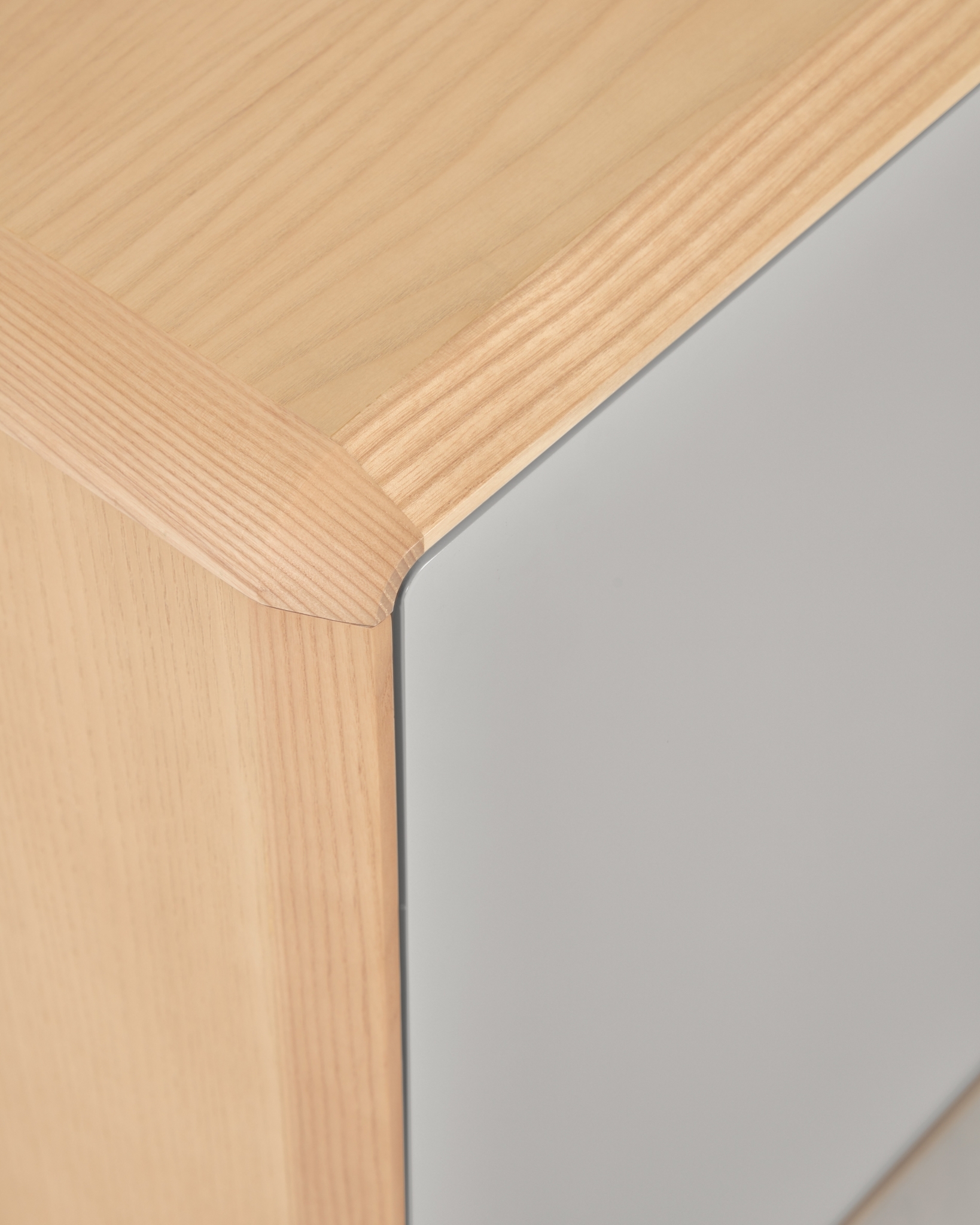 Тумба под телевизор из шпона ясеня с ножками и рамой из массива ясеня. Раздвижные двери и регулируемые ножки. Фасад окрашен в серо-белый цвет.
