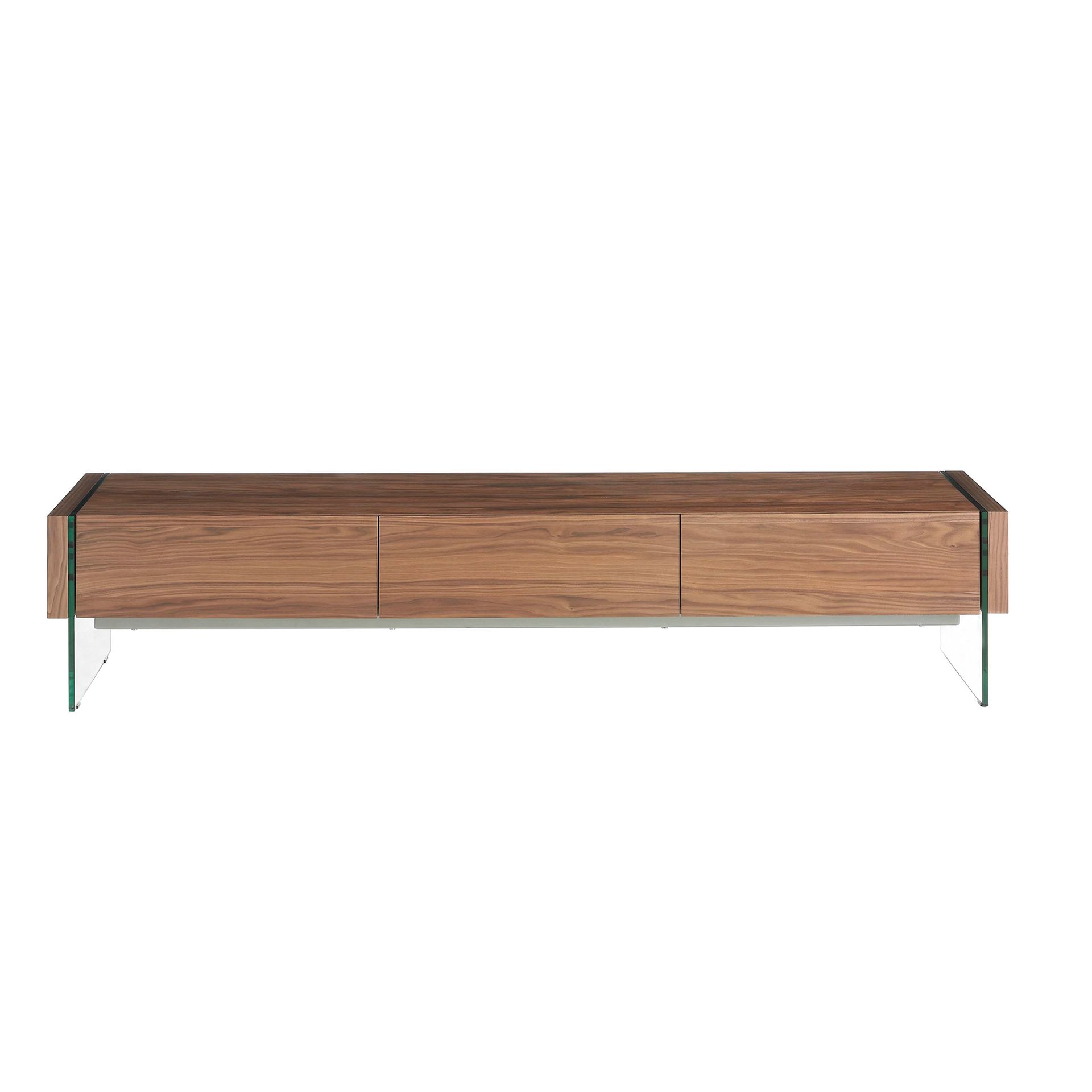 Тумба под ТВ CP1803-TV-NOGAL от фабрики Angel Cerda — полный минимализм без компромиссов. Тумба однозначно заслуживает внимания. Здесь дизайнеры буквально «повесили» в воздух каркас с ящиками, поставив его на две невидимые опоры из стекла. Такая оригинальная задумка идет в противовес с немалыми габаритами изделия, отчего она ошеломляет еще больше. Минимализм в дизайне не отвлекает, а убеждает в том, что эта тумба не нарушит созданного ранее интерьера. Тумба имеет прямоугольную форму. Она состоит из каркаса, трех выдвижных ящиков и двух стеклянных опор. Ящики одинаковые по своему размеру и соответствуют высоте каркаса. Они оснащены доводчиками на открывание и закрывание, а также прочными металлическими направляющими. Опоры сделаны из толстого закаленного стекла, способного выдерживать высокие весовые нагрузки. Для устойчивости и защиты от сколов, на нижней грани у каждой опоры имеется по два металлических наконечника. Материал изготовления каркаса с ящиками — МДФ и шпон из орехового дерева. Его теплый и, в то же время, универсальный коричневый цвет легко впишется в любой современный интерьер. А природная прочность древесины будет гарантировать долгую эксплуатацию без потери первоначального внешнего вида (при правильном уходе). Габариты тумбы: длина — 188 см, высота — 38 см, глубина — 45 см. Вес составляет 58 кг. Изделие поставляется в разобранном виде. Потребуется самостоятельная сборка (инструкция и крепеж входят в комплектацию).