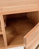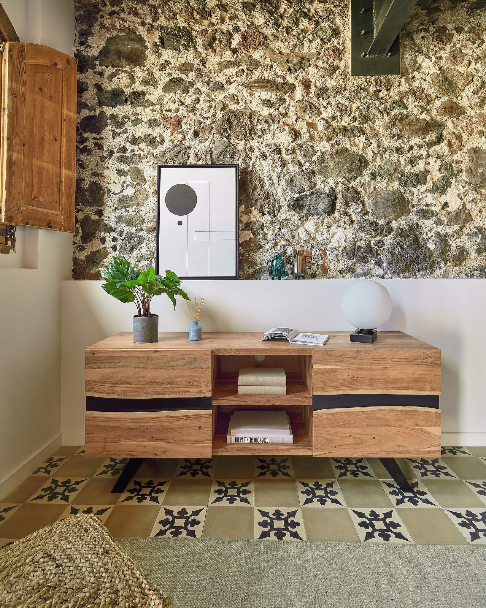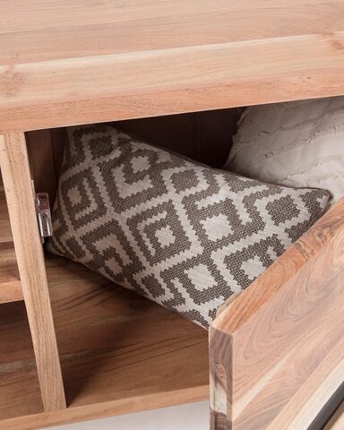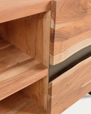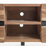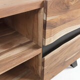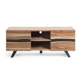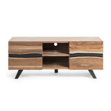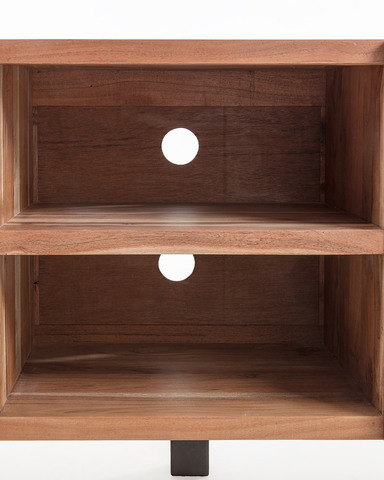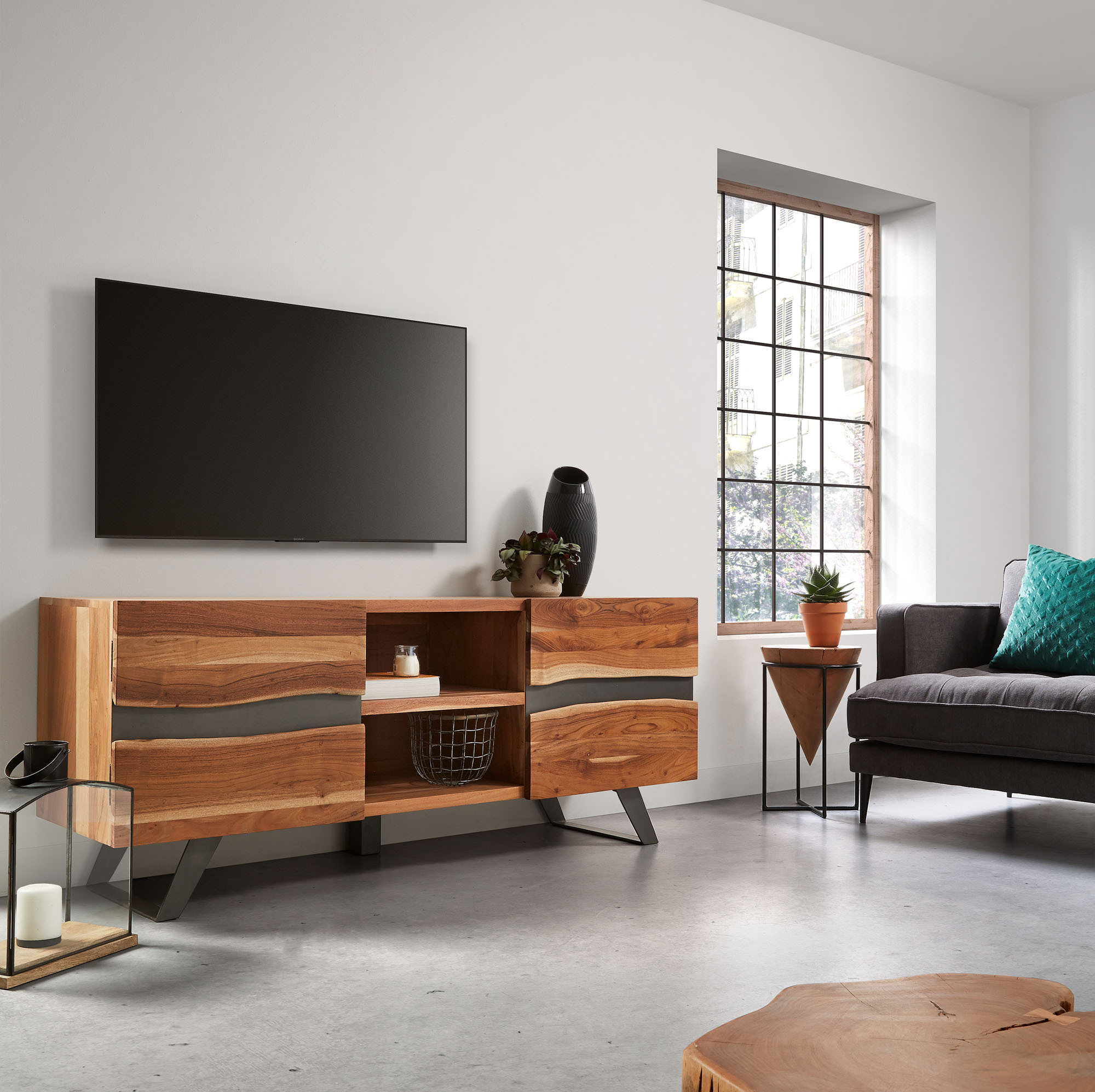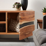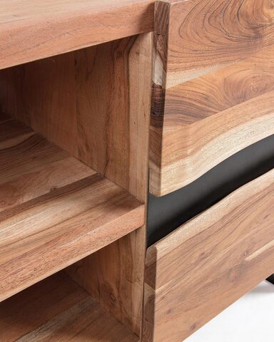 Тумба под ТВ Irvin 160x65 от фабрики La Forma – эффектная фактура для стильной городской квартиры. Тумба под ТВ Irvin – это яркий и впечатляющий дизайн. Первое, на что обращаешь внимание, это фасады дверей. Здесь природный древесный орнамент выглядит еще более ярко благодаря металлическим вставкам. А неровные границы создают эффект естественного разрыва, словно это «начинка» самого массива. Тумба прямоугольной формы. Каркас поделен на три отделения одинаковой ширины (каждое по 53 см). В центре полка делит секцию на два одинаковых яруса высотой по 20 см. На задней стенке у каждого отсека есть отверстие для вывода проводов. Слева и справа – отделения с распашными дверями и мягкой системой закрытия. Фасады дверей насажены на металлические пластины, покрытые черной порошковой краской. Материал изготовления тумбы – массив акации, покрытый полиуретаном для защиты от негативных воздействий во время эксплуатации. Опора металлическая, состоящая из из двух рамочных ножек и одной прямой. Ее высота – 14,5 см. Рамочные ножки расположены под углом, благодаря чему увеличивается площадь опоры и лучше распределяется весовая нагрузка. Размеры изделия: длина – 160 см, глубина – 43 см, высота – 65см. Вес – 61,3 кг. Потребуется сборка. Инструкция и крепеж включены в комплектацию.