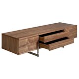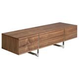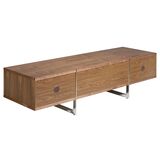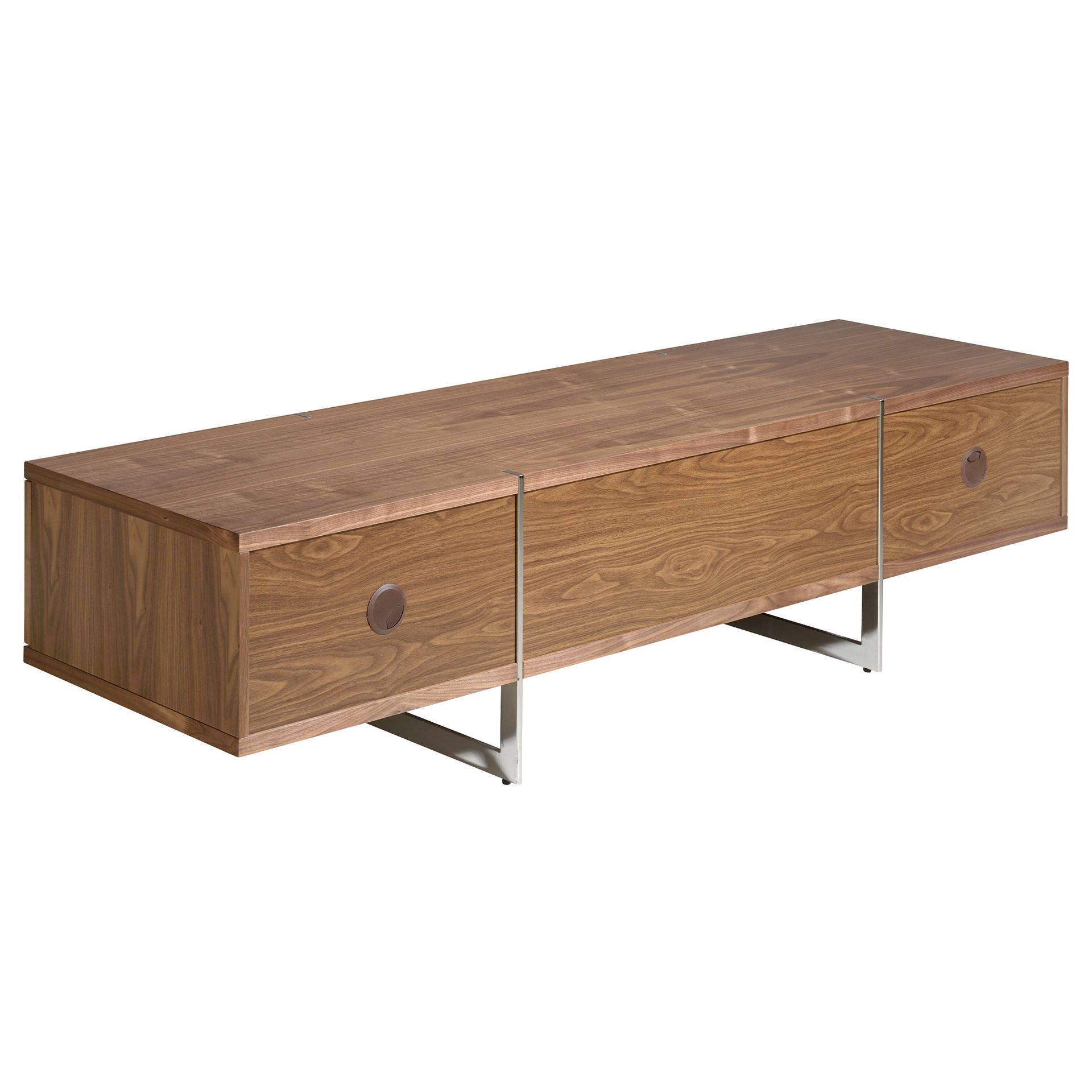 Тумба под ТВ LE312 от фабрики Angel Cerda — необычная конструкция для европейских интерьеров. Тумба впечатляет своей непростой и оригинальной сборкой. Рамочные ножки буквально «разрезают» изделие на три части, но при этом, не проходят сквозь столешницу. Такая дизайнерская задумка выглядит не только необычно, но и обеспечивает равномерное распределение нагрузки. Модель создана для небанального европейского интерьера, где преобладает мебель из дерева. Тумба ТВ LE312 имеет форму вытянутого прямоугольника. Конструкция представляет собой каркас, в котором находится четыре ящика, из двух рамочных опор. Ящики, находящиеся в центральной секции, выдвижные. Они оснащены доводчиками и прочными металлическими направляющими. Материал изготовления — МДФ и шпон орехового дерева. Эта порода обладает красивым природным орнаментом, который нашел широкое распространение в современных интерьерах. Опоры визуально делят изделие на три одинаковых сектора, обеспечивая хорошую устойчивость. Они сделаны из хромированной стали, благодаря чему изделие способно ежедневно выдерживать высокую весовую нагрузку. Размеры тумбы: длина — 180 см, высота — 46 см, глубина — 56 см. Вес составляет 60 кг. Изделие поставляется в собранном виде.