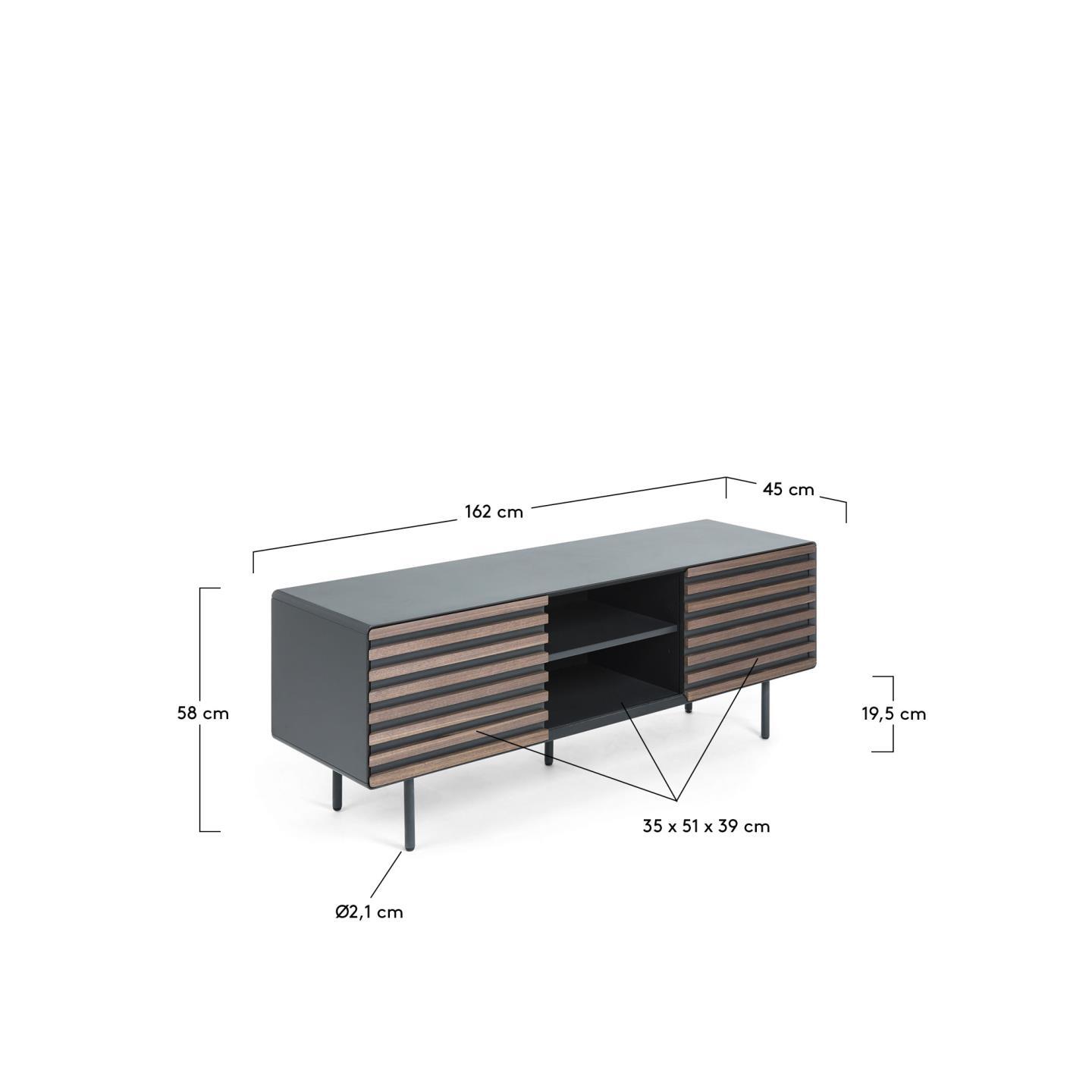 Тумба под ТВ Mahon орех от фабрики La Forma – стильный дизайн и лаконичная конструкция. Тумба под ТВ Mahon выглядит эффектно и стильно. Главная особенность модели – это полосатый фасад, созданный из двух оттенков дерева. Он первый привлекает внимание своим ярким видом. Раздвижная конструкция – второй плюс, относящийся уже к эргономике модели. В зависимости от интерьера или содержимого тумбы, положение дверей можно менять всего за мгновение. Тумба прямоугольной формы. Каркас сборный, со скругленными углами. Он вертикально поделен перегородкой на два или три отделения (зависит от выбранной модели). Полки и каркас сделаны из МДФ с матовой ламинацией графитового цвета. Покрытие обеспечивает стойкость к негативным внешним воздействиям, облегчает уход за изделием. Изделие оснащено одной или двумя передвижными дверями, которые вставлены в металлические полозья. Они работает по принципу «купе». Двери также сделаны из МДФ, на который насажены рейки из шпона орехового дерева. Ножки из металла, трубчатые. Их высота – 19,5 см, диаметр – 2,5 см. Для защиты напольного покрытия от повреждений, есть стабилизирующие наконечники. Размеры: длина – 120 или 162 см, глубина – 45 см, высота – 48,5 или 58 см. Потребуется сборка. Инструкция и крепеж входят в комплектацию. В коллекцию Mahon также включены консоль, буфет, письменный стол.