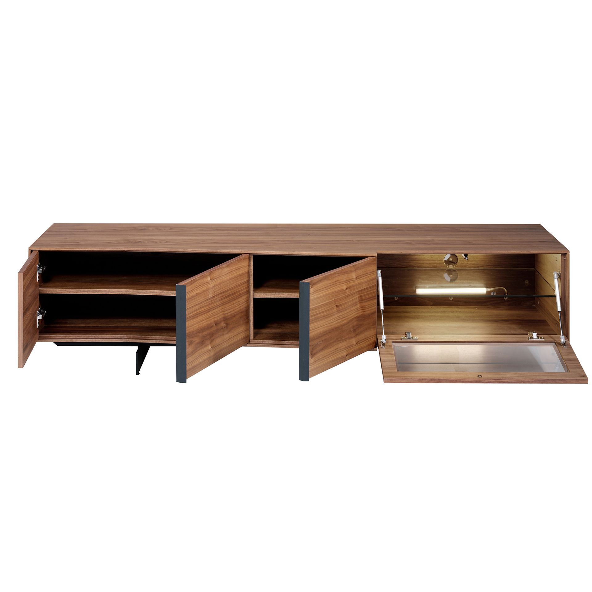Тумба под ТВ MF2005TV /3219 от фабрики Angel Cerda – насыщенная система хранения с эффектной подсветкой справа. Тумба под ТВ MF2005TV /3219 – это прекрасная возможность обеспечить упорядоченное хранение вещей помимо установки телевизора. Совершенно ошеломительная по своим возможностям система хранения – одна из особенностей этой модели. С ней навести порядок в гостиной будет легко и просто. А для украшения помещения и яркого акцента – отделение с подсветкой. Пусть красота, функциональность и стиль поселяться в вашей гостиной! Тумба имеет каркасную основу, которая сделана из высококачественного МДФ. Сверху покрытие из натурального орехового шпона толщиной 0,5 мм. Внутреннее наполнение состоит из двух отделений с боковыми створками и одного с откидной стеклянной дверью. Створки оснащены мягкой системой открытия, не имеют ручек. Внутри – полки, расположенные параллельно друг другу. В отделении с откидной дверью установлена лампа. Тумбу удерживают металлические ножки высотой 13 см с черным матовым покрытием. На каждой установлен наконечник для защиты от деформации напольного покрытия. Размеры тумбы: ширина – 200 см, высота – 48 см, глубина – 55 см. Вес изделия – 84 кг. Потребуется самостоятельная сборка. Инструкция и крепеж включены в комплектацию.