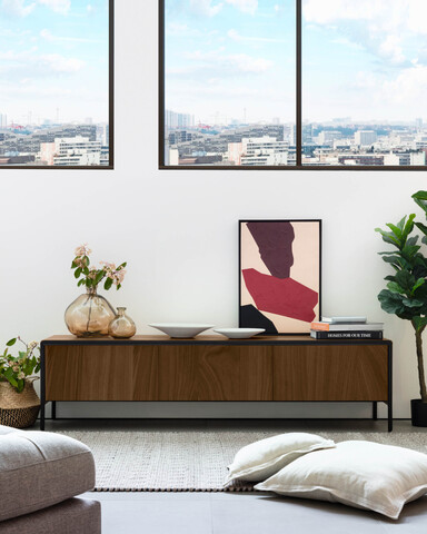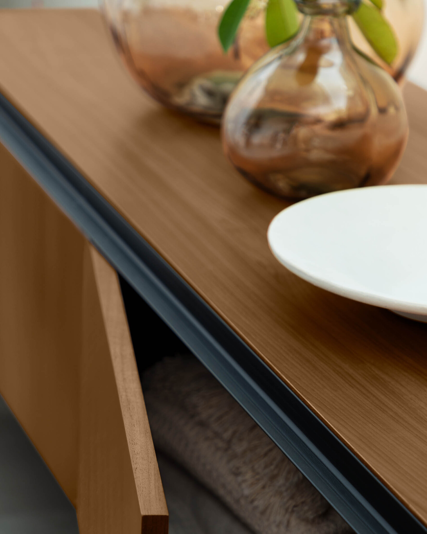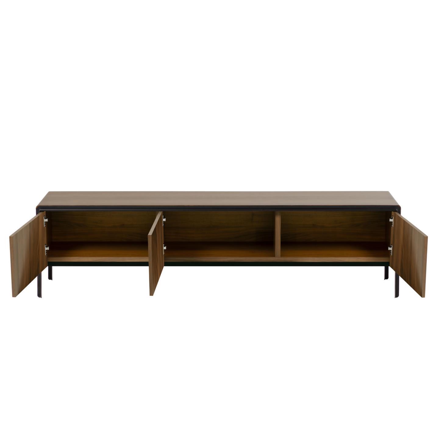 Тумба под ТВ Nadyria 180X42 ореховая от фабрики La Forma – минимализм по максимуму. Тумба под ТВ Nadyria впечатлит любого поклонника минимализма. Арочное обрамление подчеркивает четкую геометрию, а об эргономике говорят впечатляющие габариты. Есть два цвета – дуб и орех. И оба – лидеры в европейском минимализме. Выбор за вами! Тумба прямоугольной формы, с закругленными углами. Каркас разделен вертикальными перегородками на три равных отделения шириной по 56 см. Двери открываются путем нажатия (ручки отсутствуют). Материал изготовления тумбы – шпон дуба или ореха (зависит от выбранной модели) с лаковым покрытием. Каркас с обеих сторон обрамляет металлическая арка, которая выполняет роль опоры. Высота ножек – 25 см. Максимально допустимая нагрузка на тумбу составляет 80 кг. Размеры изделия: длина – 180 см, глубина – 43 см, высота – 50 кг. Вес – 50,2 кг. Потребуется самостоятельная сборка. Рекомендуется участие двух человек. Инструкция и крепеж включены в комплектацию. В коллекцию Nadyria также входит письменный и обеденный стол, сервант, стеллаж.